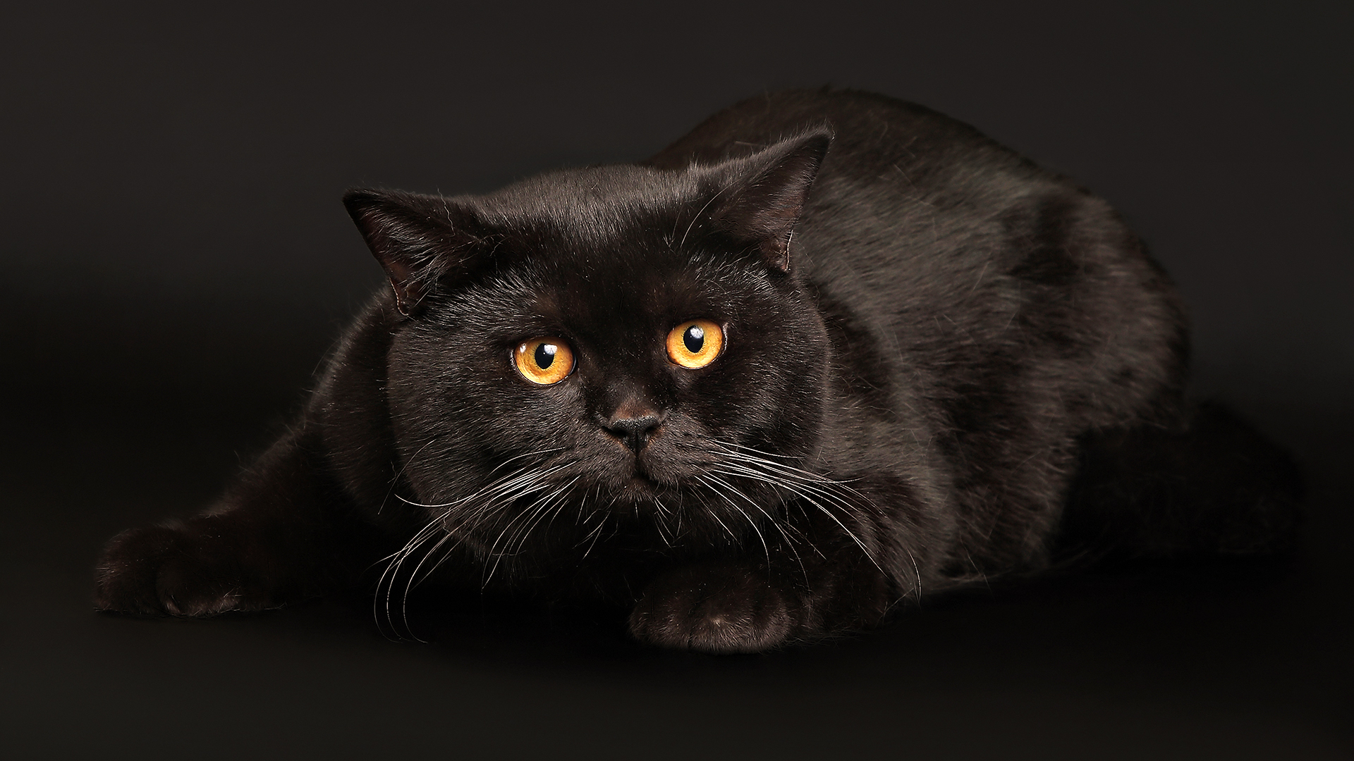 Description: A black cat with yellow eyes laying down on a black surface with a black background and a black background.