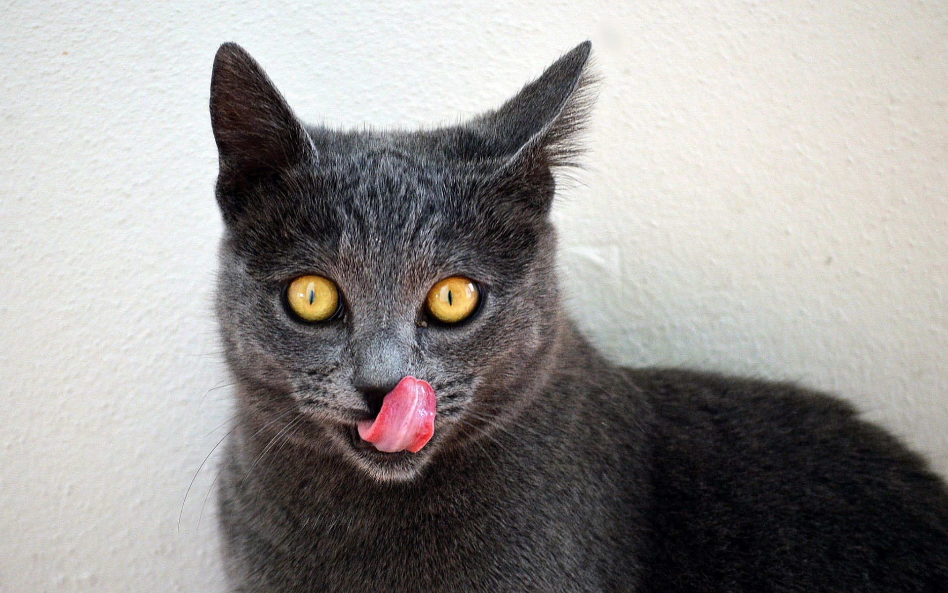 Description: A cat with its tongue out and its tongue out with its tongue out and yellow eyes and a white wall behind it.