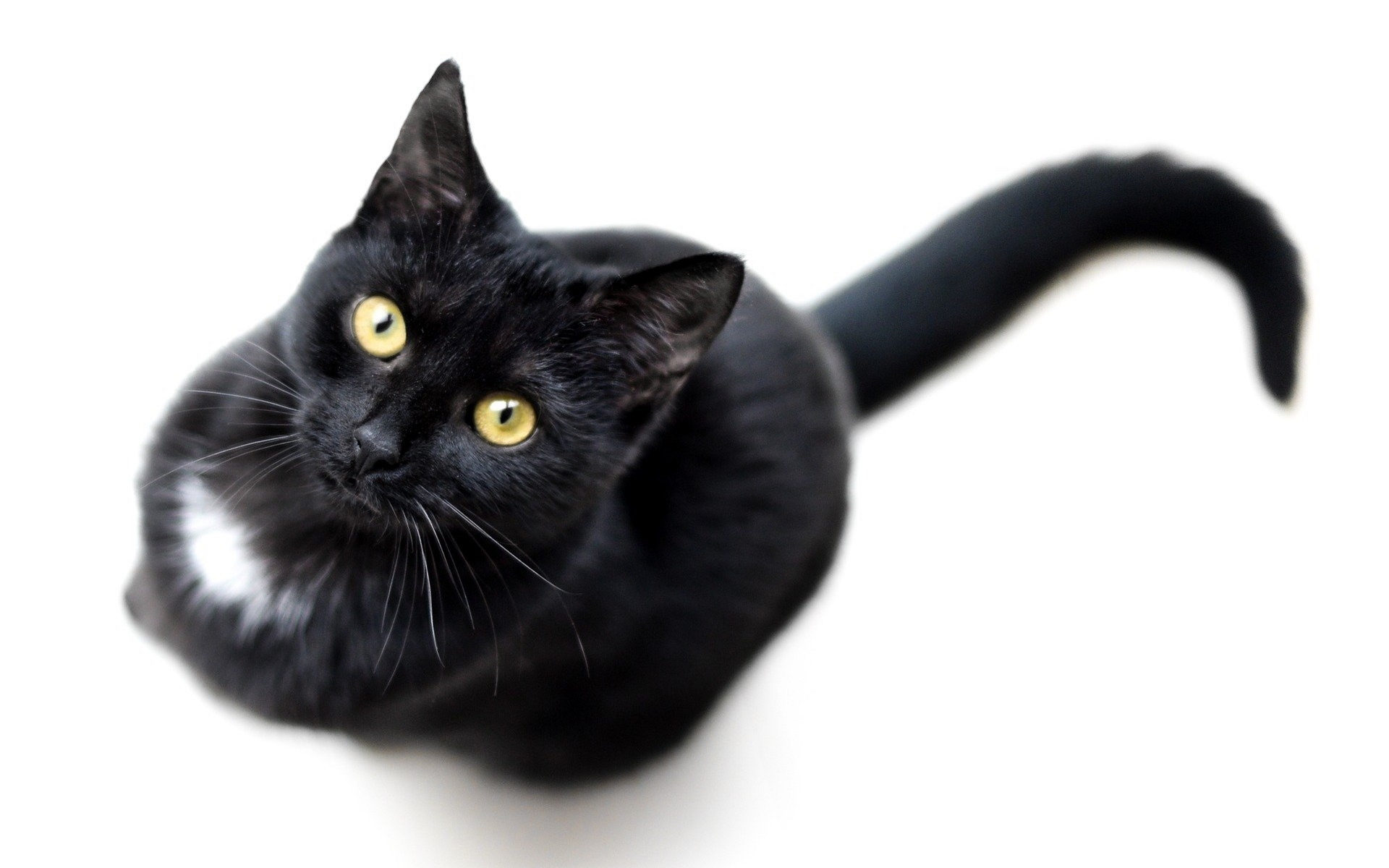 Description: A black cat with yellow eyes looking up at the camera with a white background and a black cat with yellow eyes looking up at the camera.
