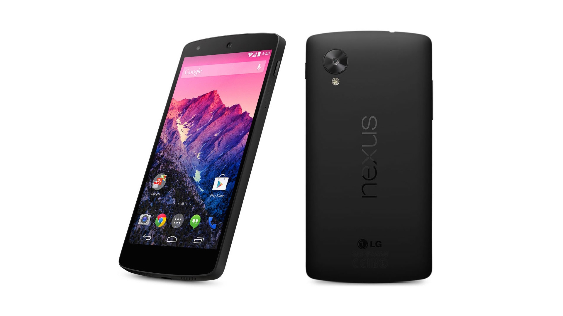 Description: A black cell phone with a picture of a mountain in the background and a pink sky in the background.