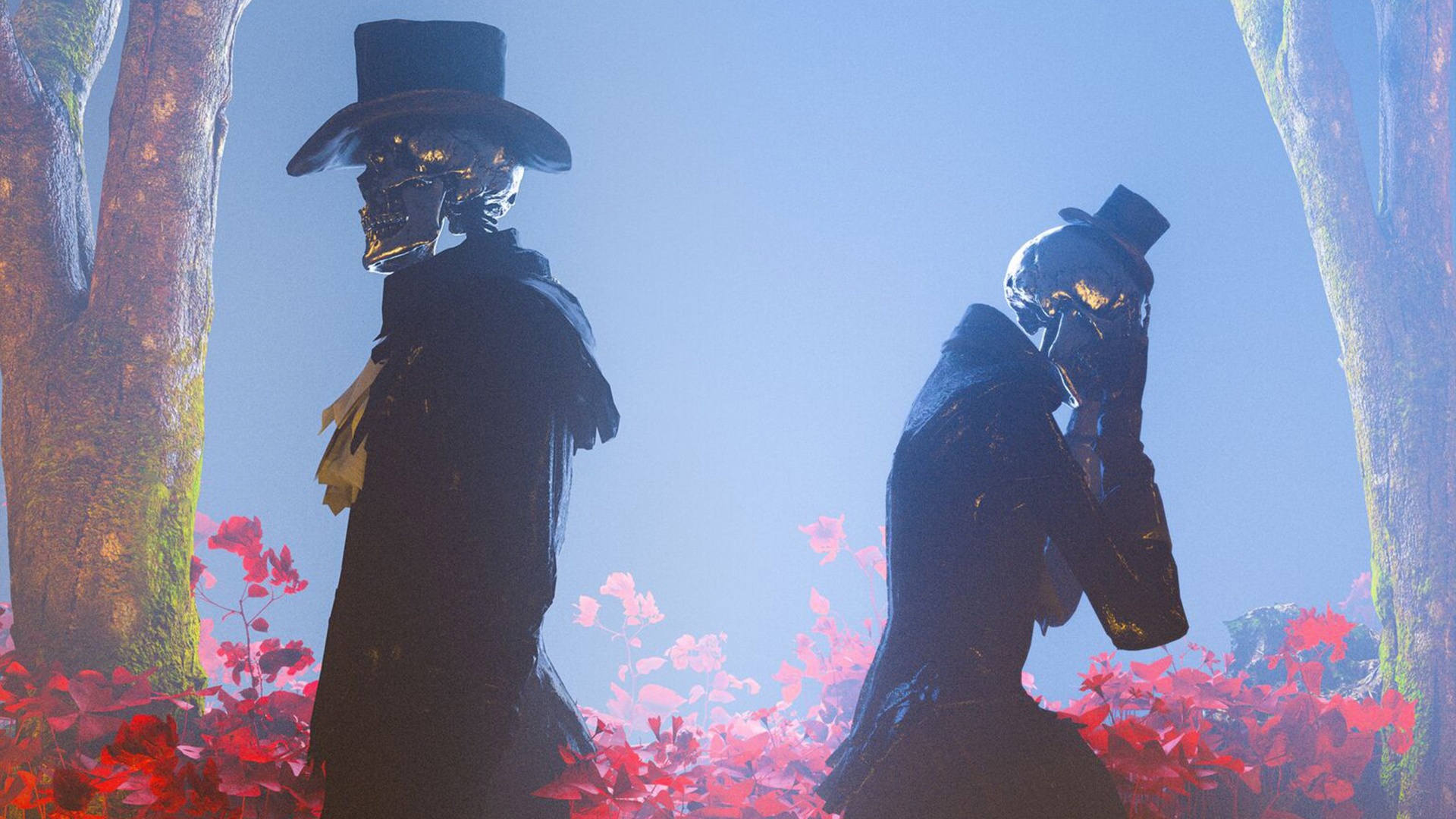 Description: Two people in black costumes standing in front of trees and flowers with a sky background and a blue sky.