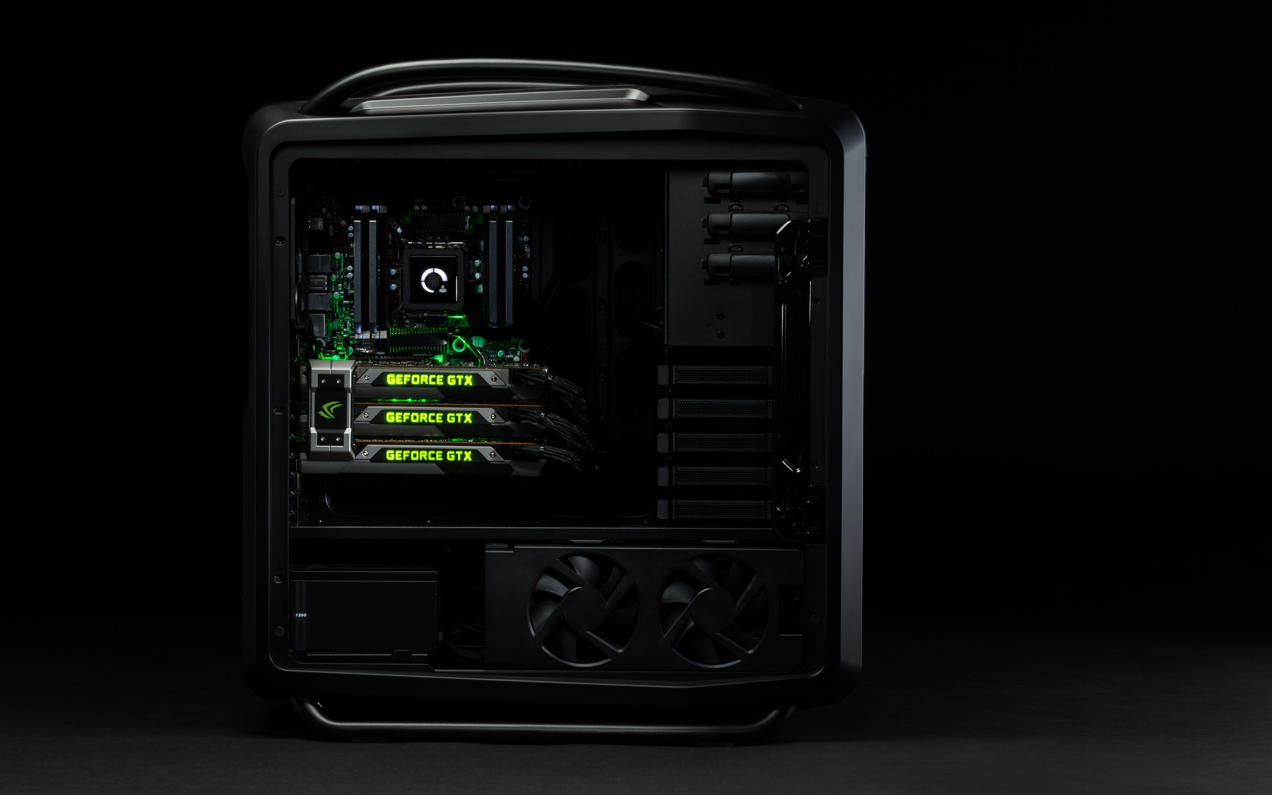 Description: A black computer case with green lights on it's sides and a black background with a black background.