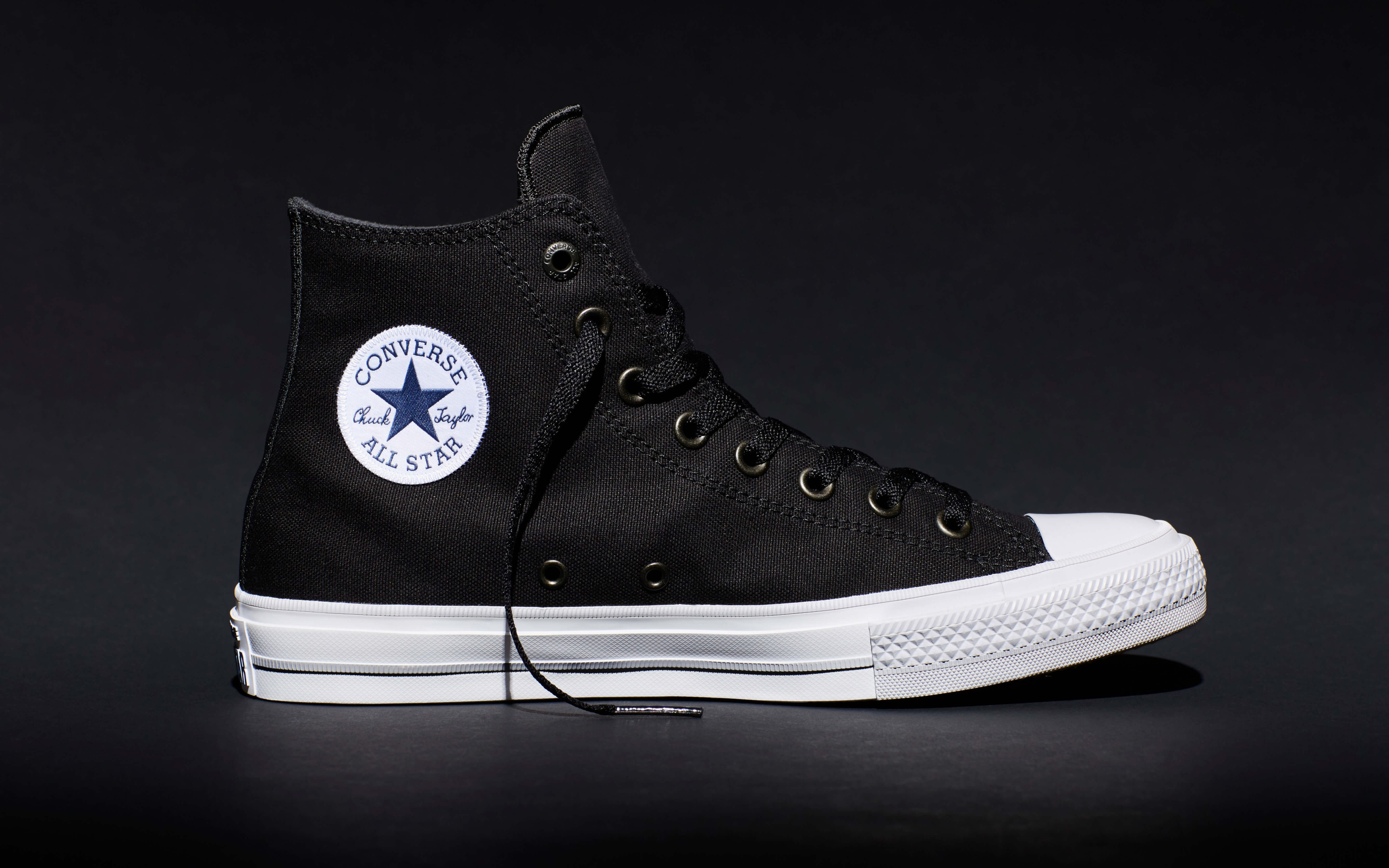 Description: A black converse shoe with a white star on the side of it and a black background with a white stripe.