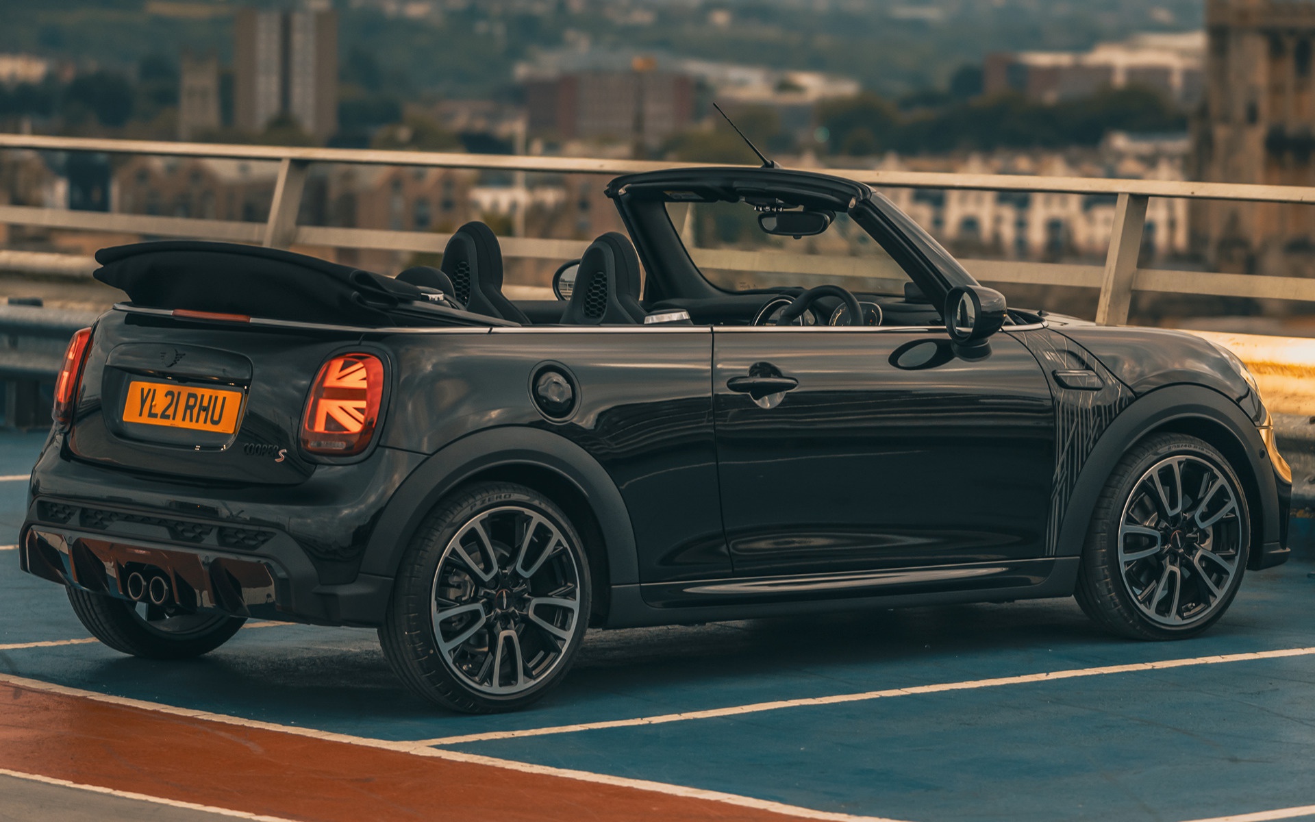 Description: A small black convertible car parked in a parking lot with a city in the background and a yellow light.
