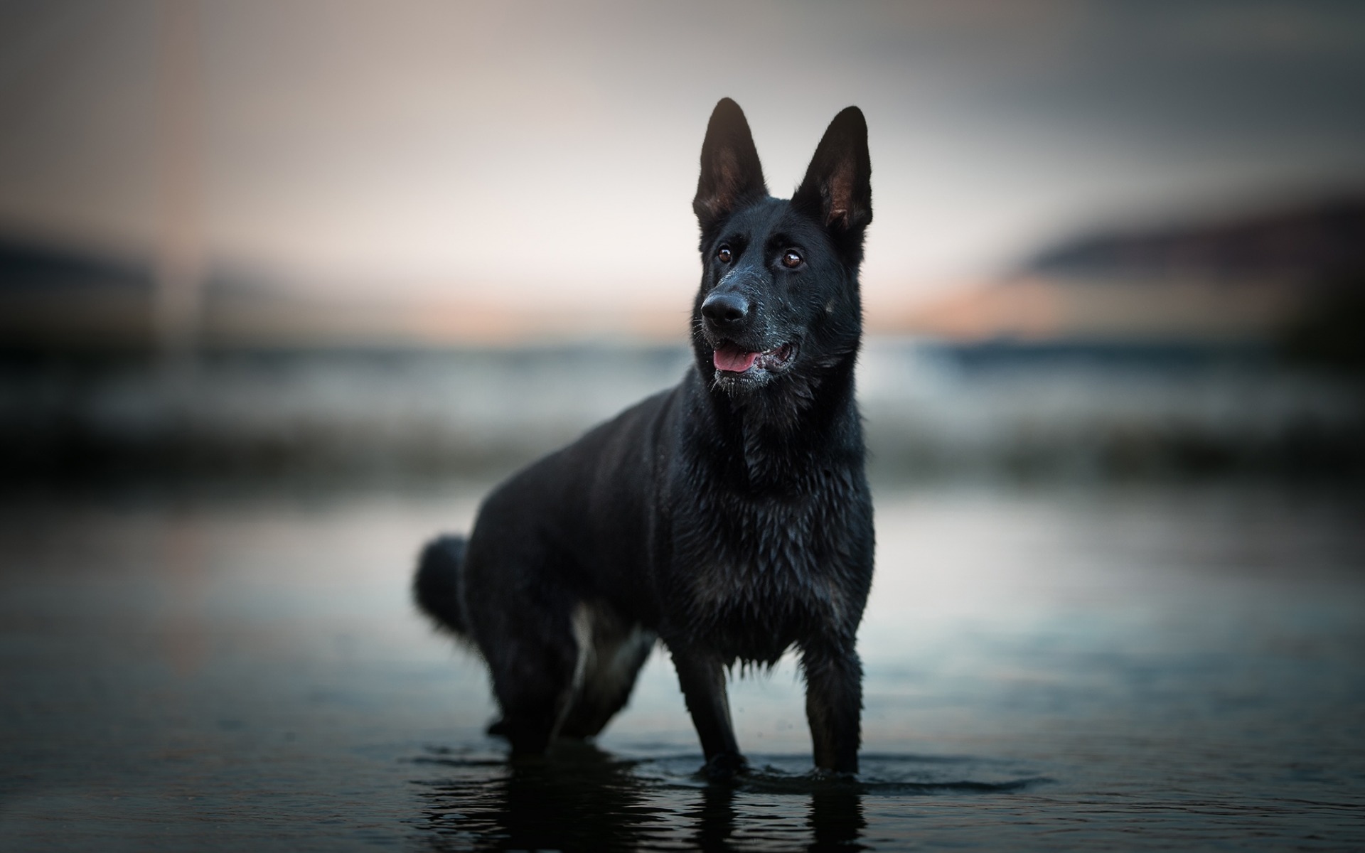 Description: A black dog standing in the water at the beach at sunset or dawn with a blurry sky in the background.