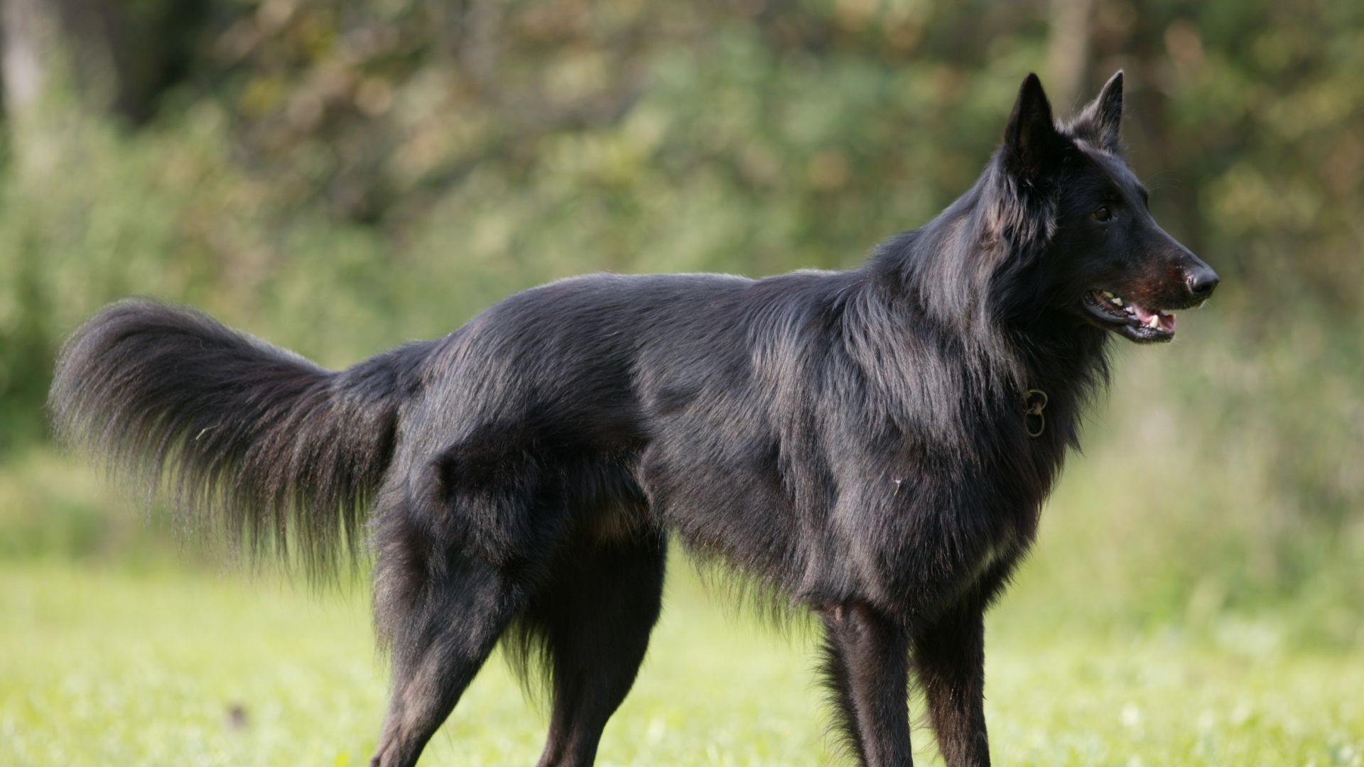 Description: A black dog standing in a field of grass with trees in the background and a frisbee in the foreground.