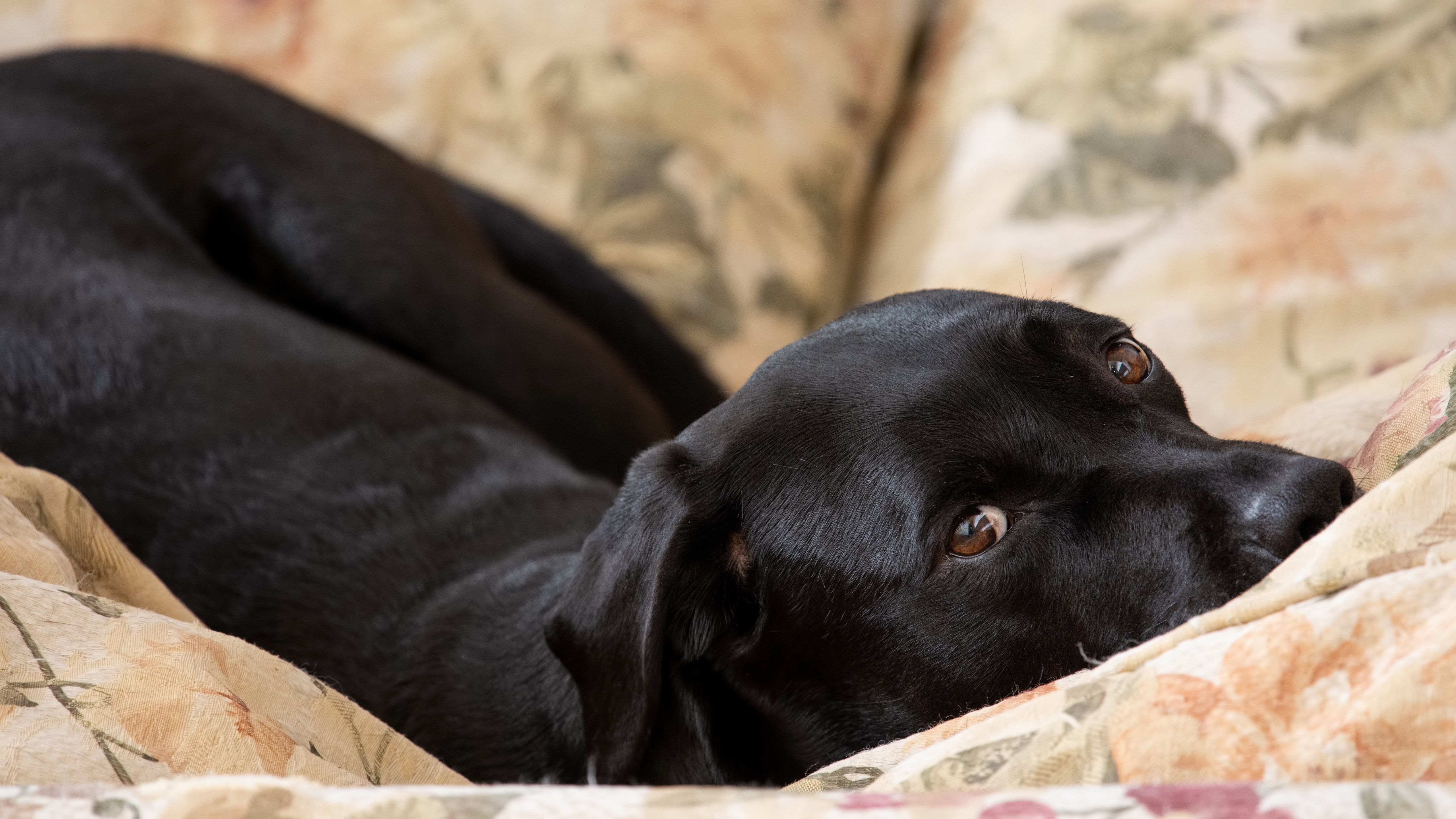 Description: A black dog laying on a couch with a blanket on it's back and eyes open and looking up.
