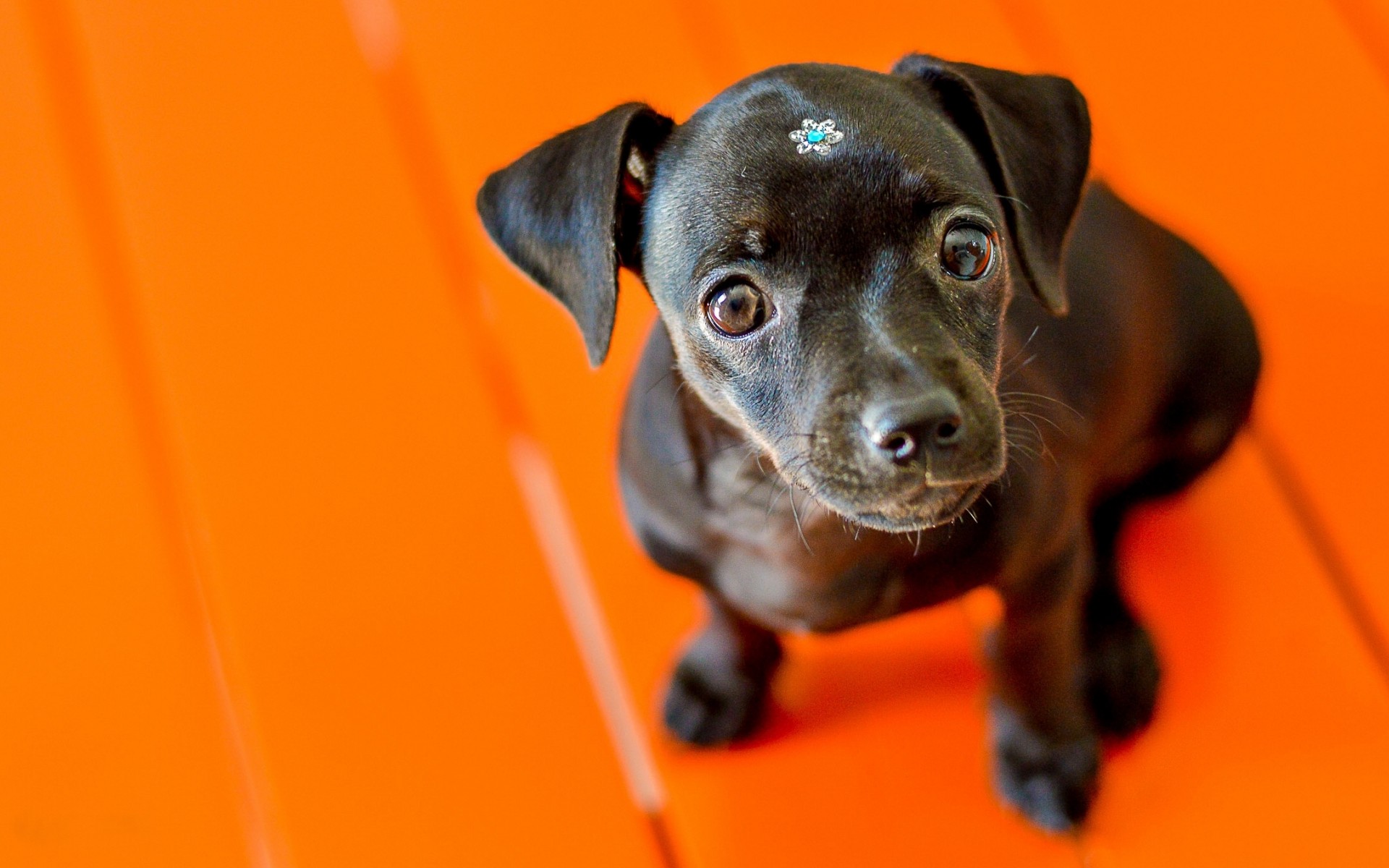 Description: A small black dog sitting on a bright orange surface with a diamond on its head and a tiny blue diamond on its forehead.