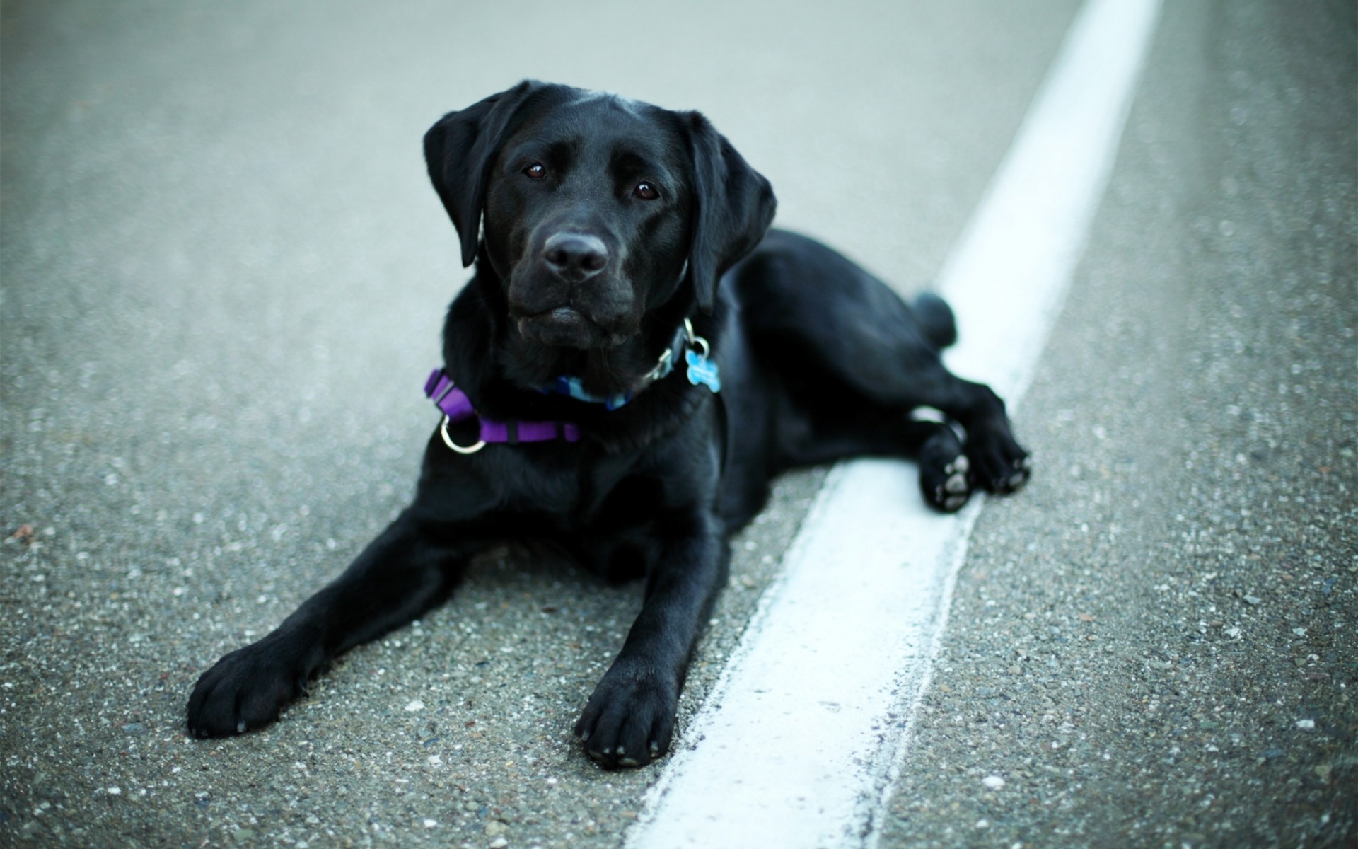 Description: A black dog laying on the side of the road with a purple collar on it's neck and a purple collar on its neck.