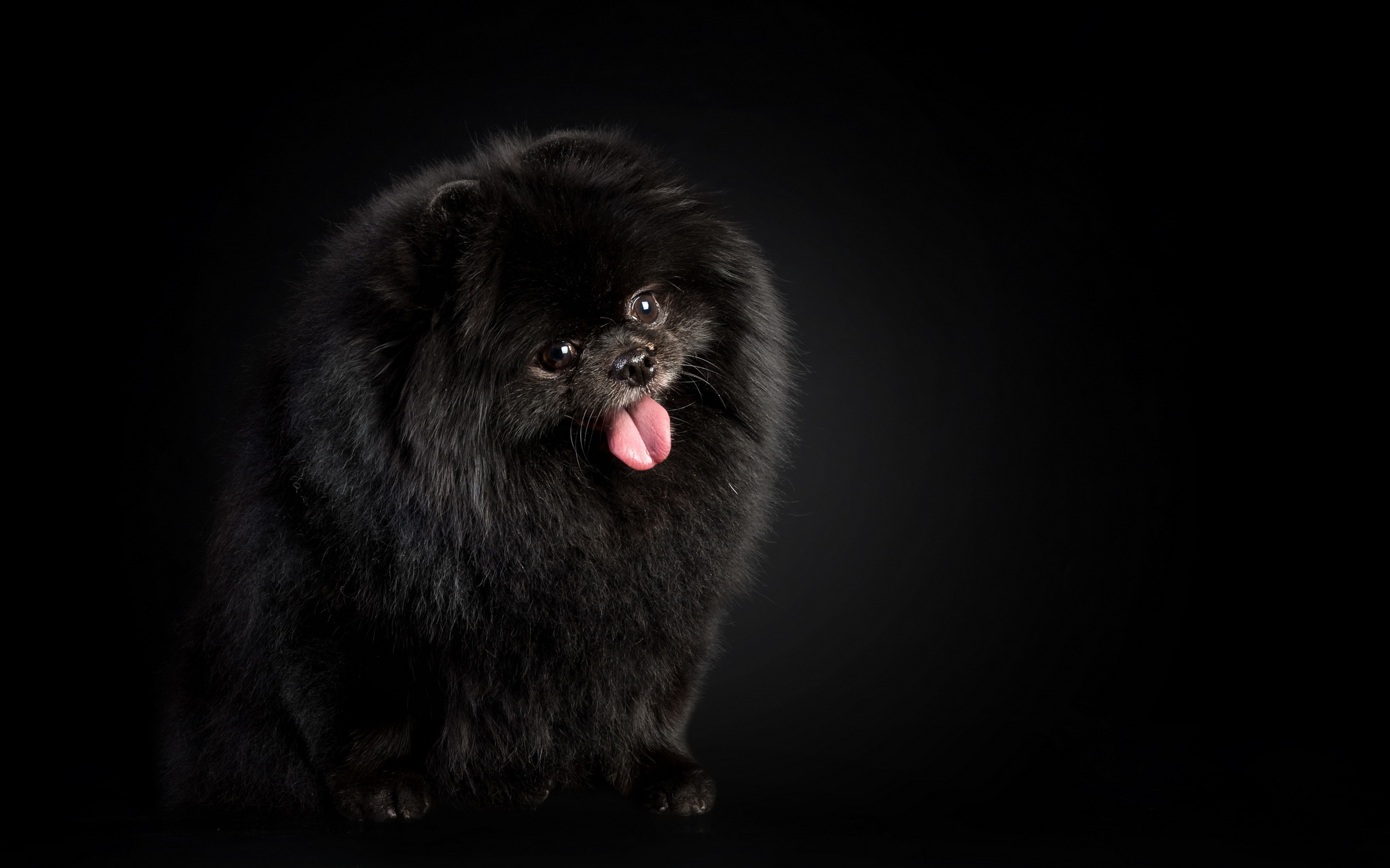 Description: A black dog with its tongue out and tongue out on a black background with a black background and a black background with a black background.