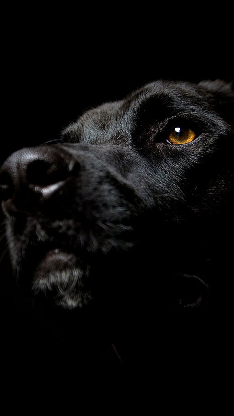 Description: A black dog with a yellow eye looking up at something in the dark sky with a black background and a black background.