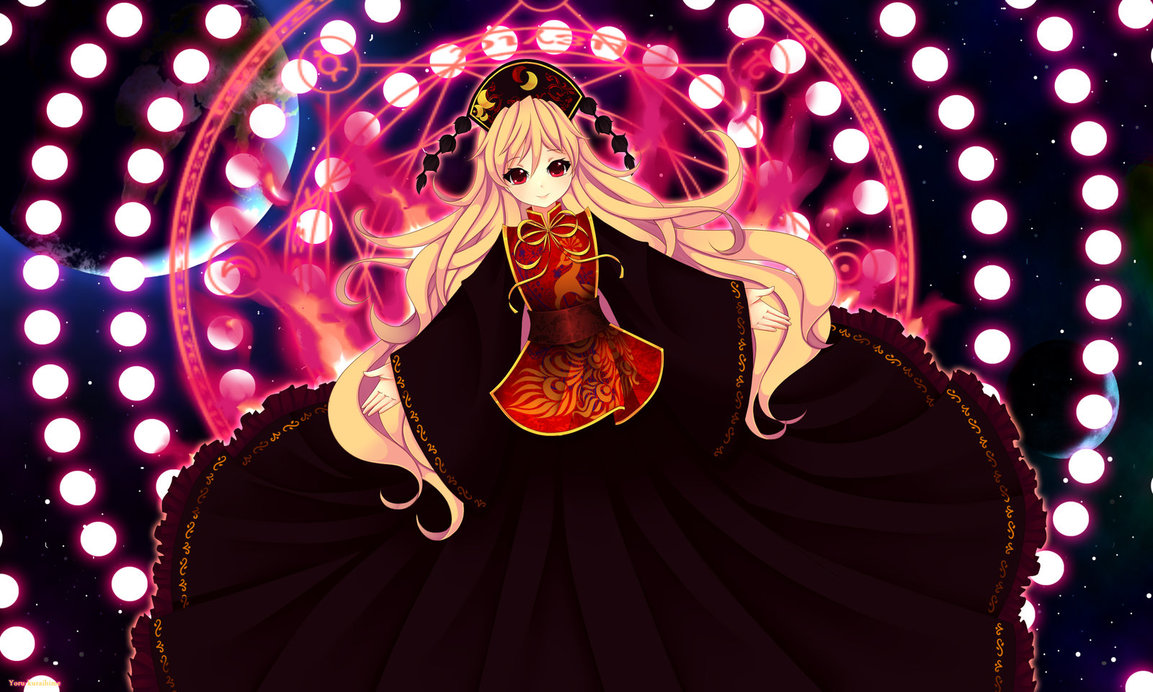 Description: A woman in a black dress with a red and yellow hat and a black dress with a red and white design.