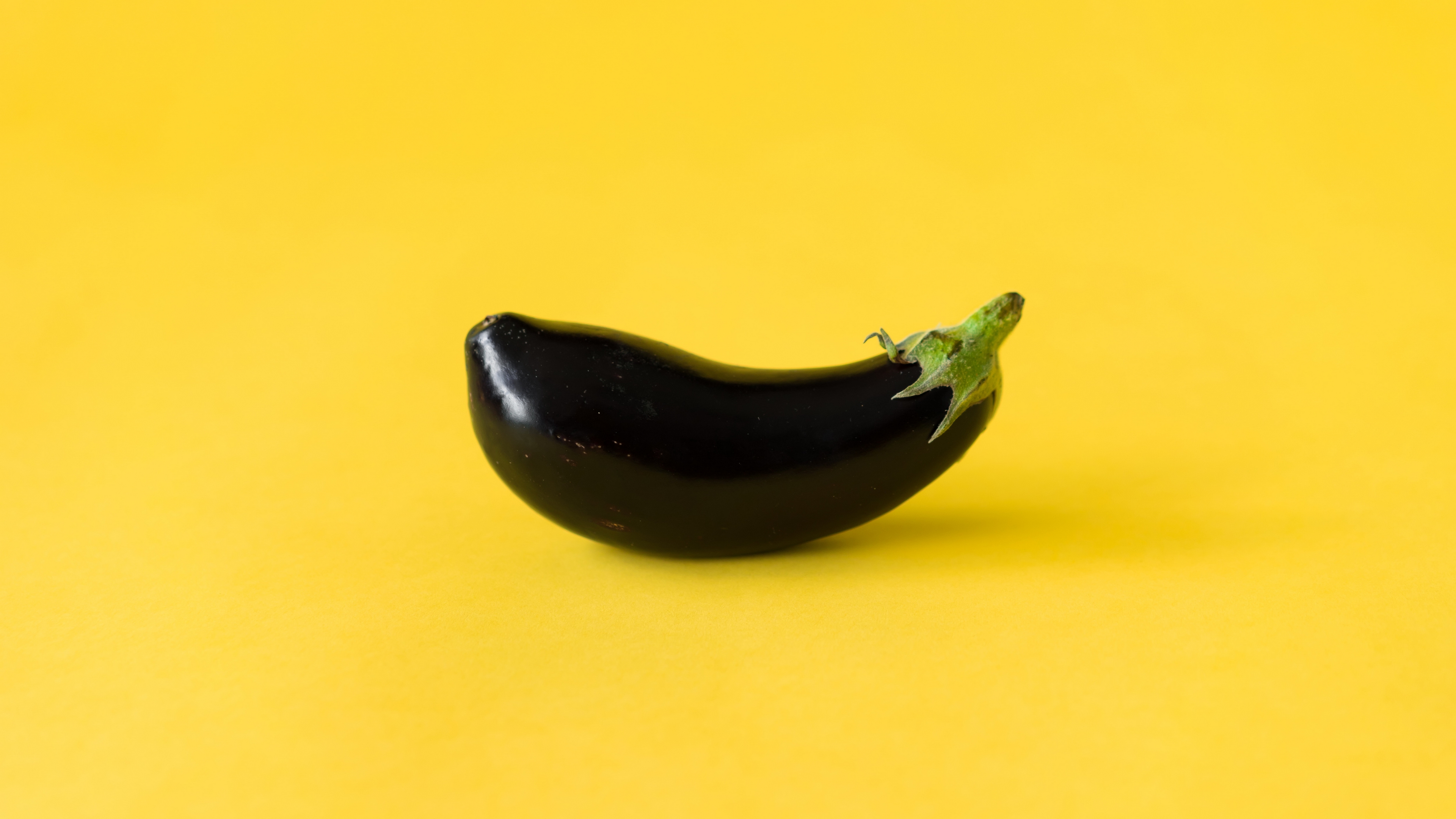 Description: A black eggplant on a yellow background with a green frog on top of it's head.