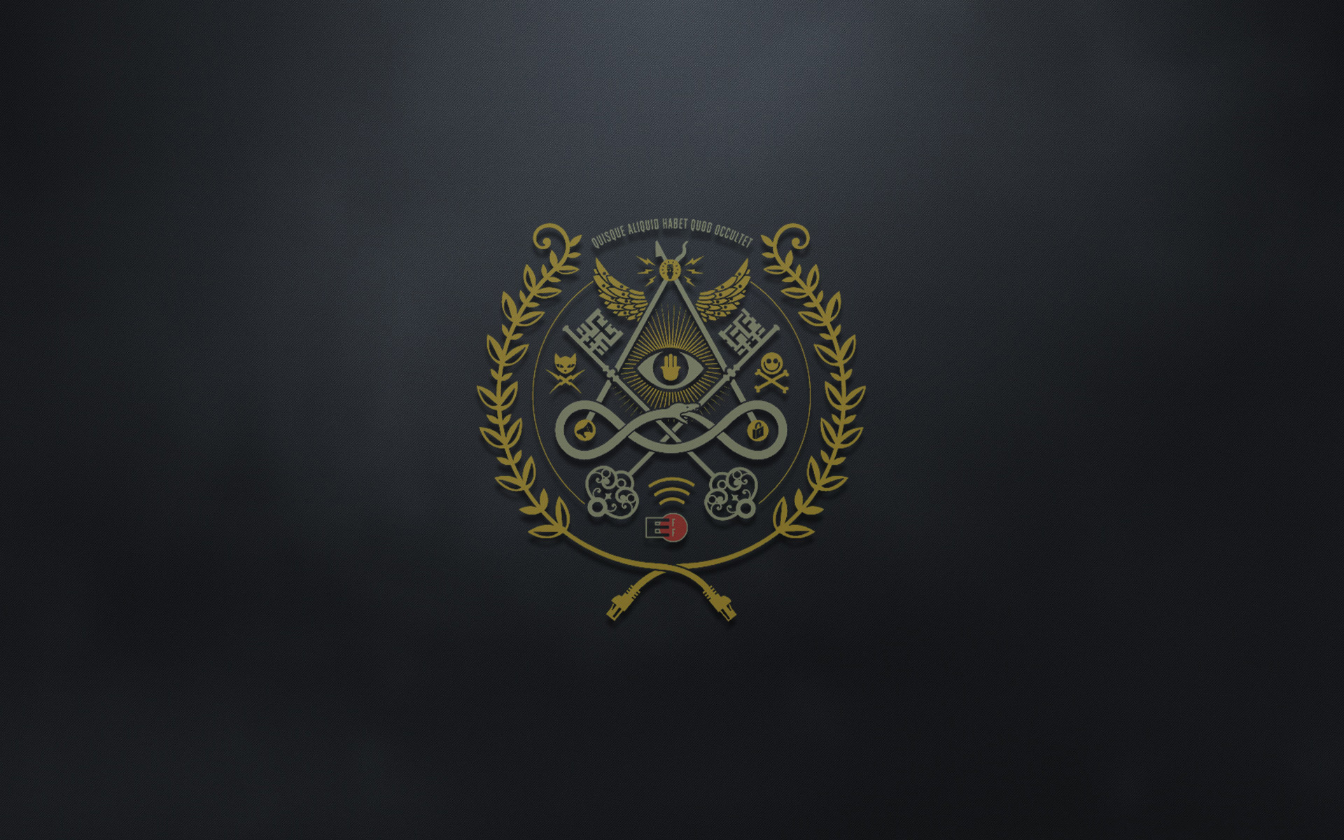 Description: A black and gold emblem with a triangle and an eye on it's center surrounded by a laurel.