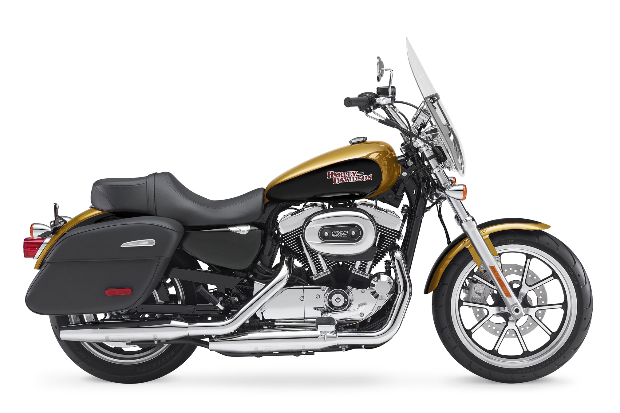 Description: A black and gold motorcycle is parked on a white background with a white background behind it and a black seat.