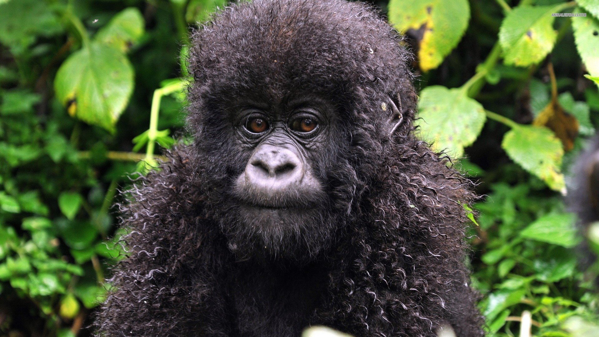 Description: A black gorilla sitting in front of a bush with green leaves on it's sides and a big smile on its face.