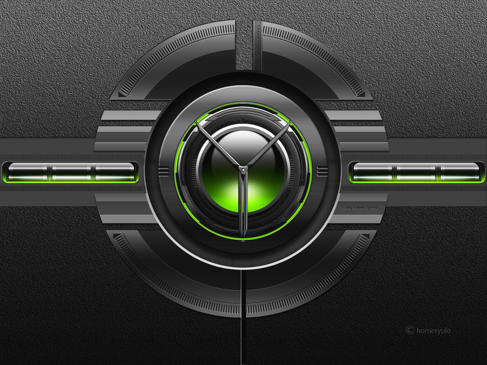 Description: A black and green wallpaper with a circular design on it's side and a green stripe on the bottom.