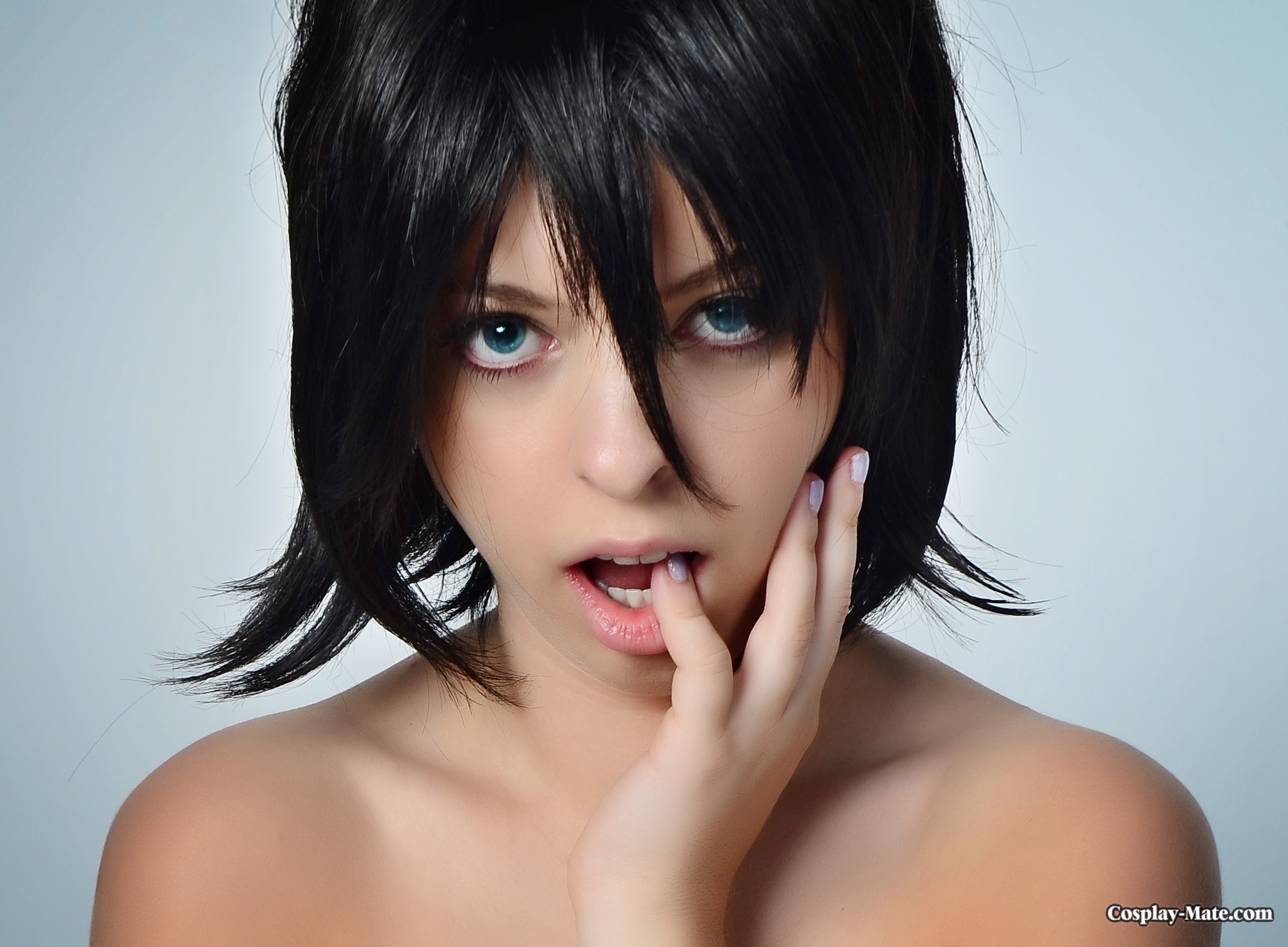 Description: A woman with black hair and blue eyes posing for a picture with her hand on her face and her hand on her cheek.