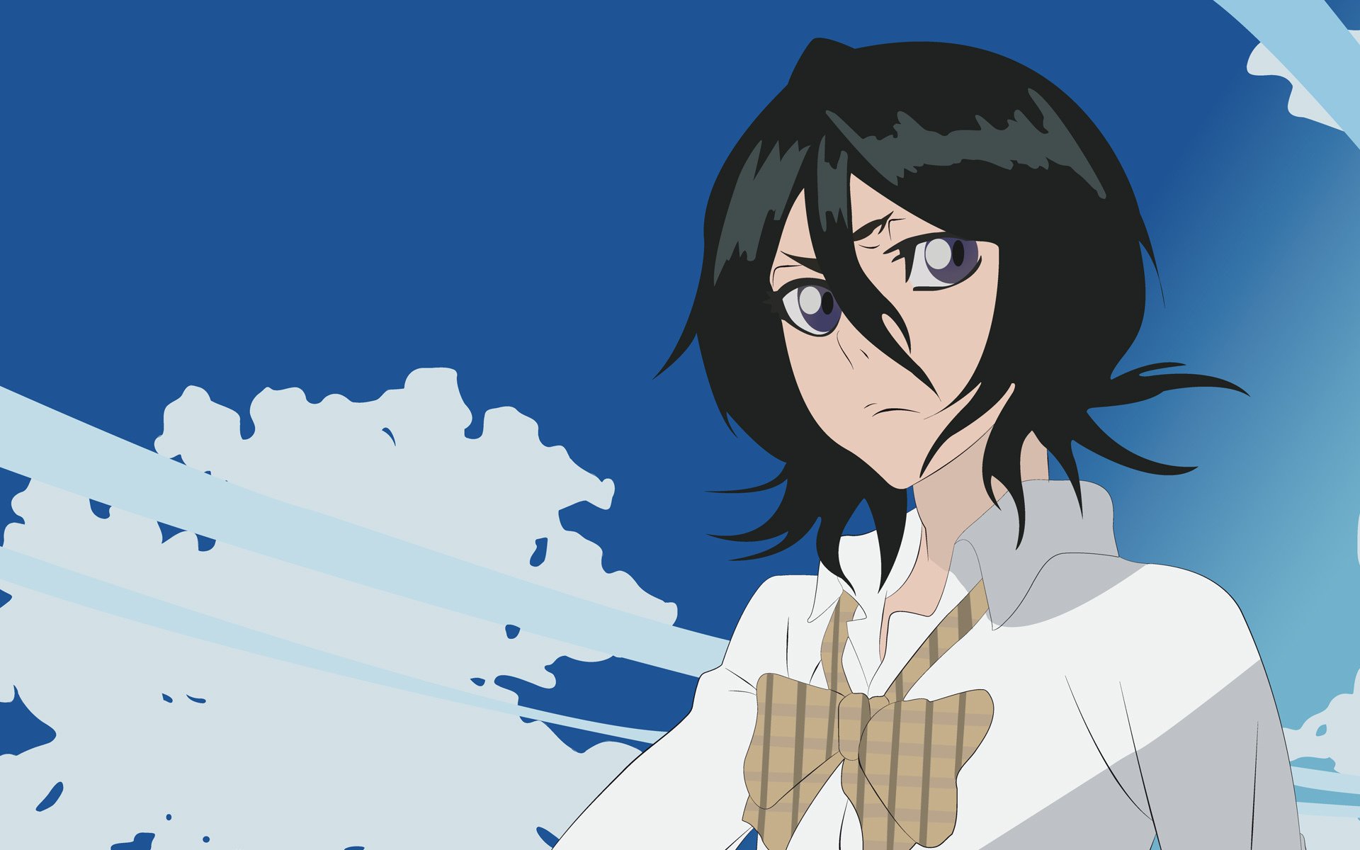 Description: A woman with black hair and a bow tie standing in front of a blue sky with clouds and trees.