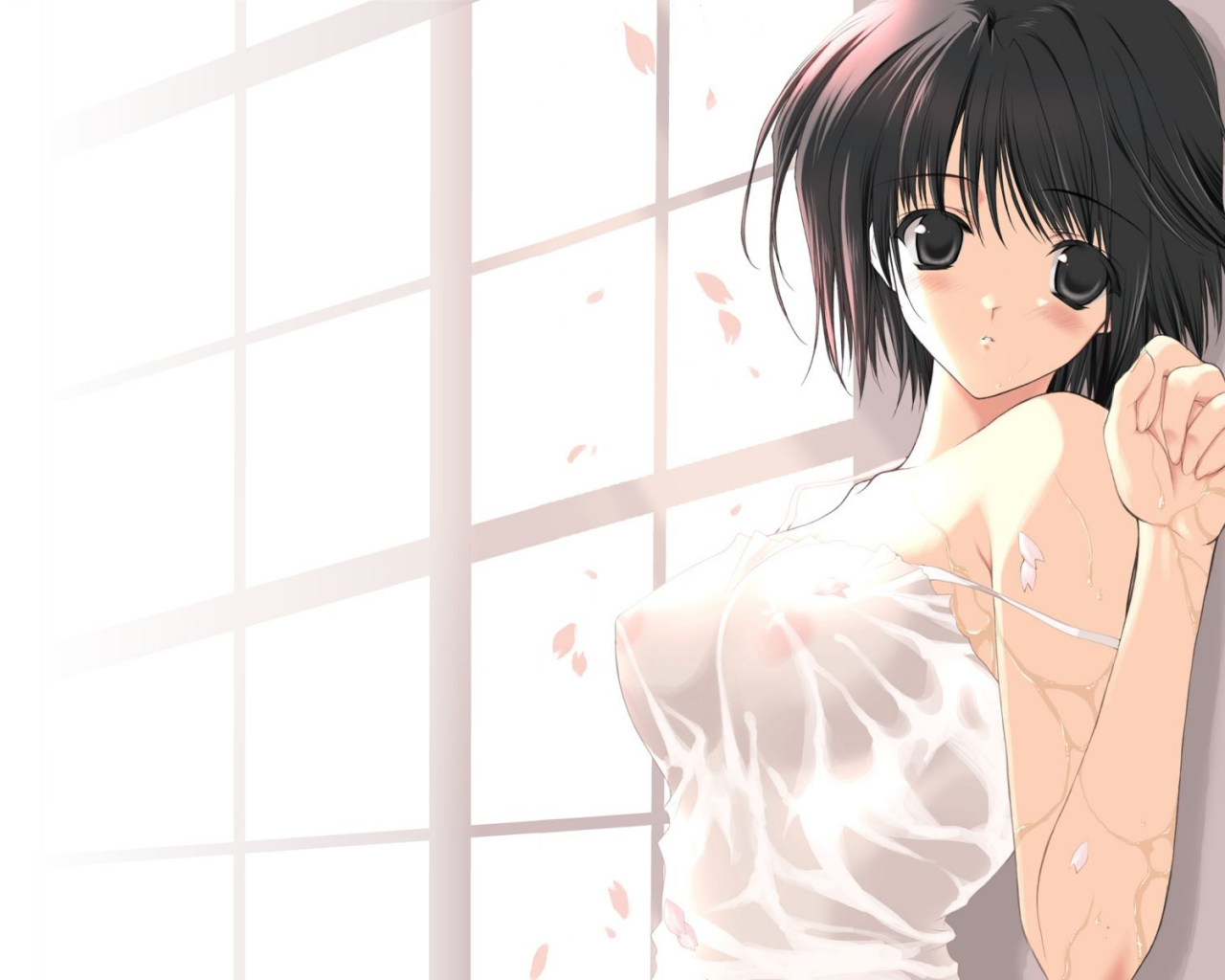 Description: A woman with black hair and big breast posing for a picture in front of a window with a curtain.