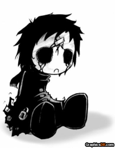 Description: A drawing of a person with black hair and a black outfit sitting down with a black and white background.