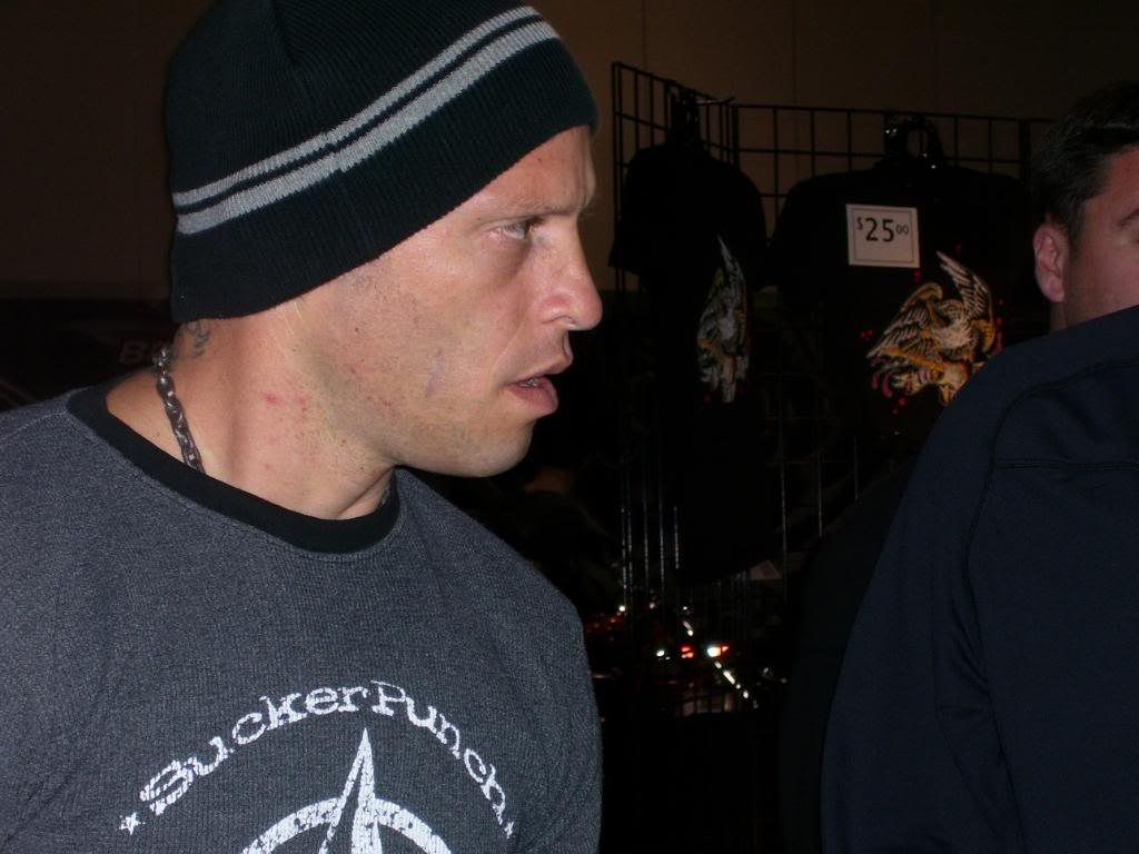 Description: A man wearing a black hat and a black shirt with a star on it and a black and white striped beanie.