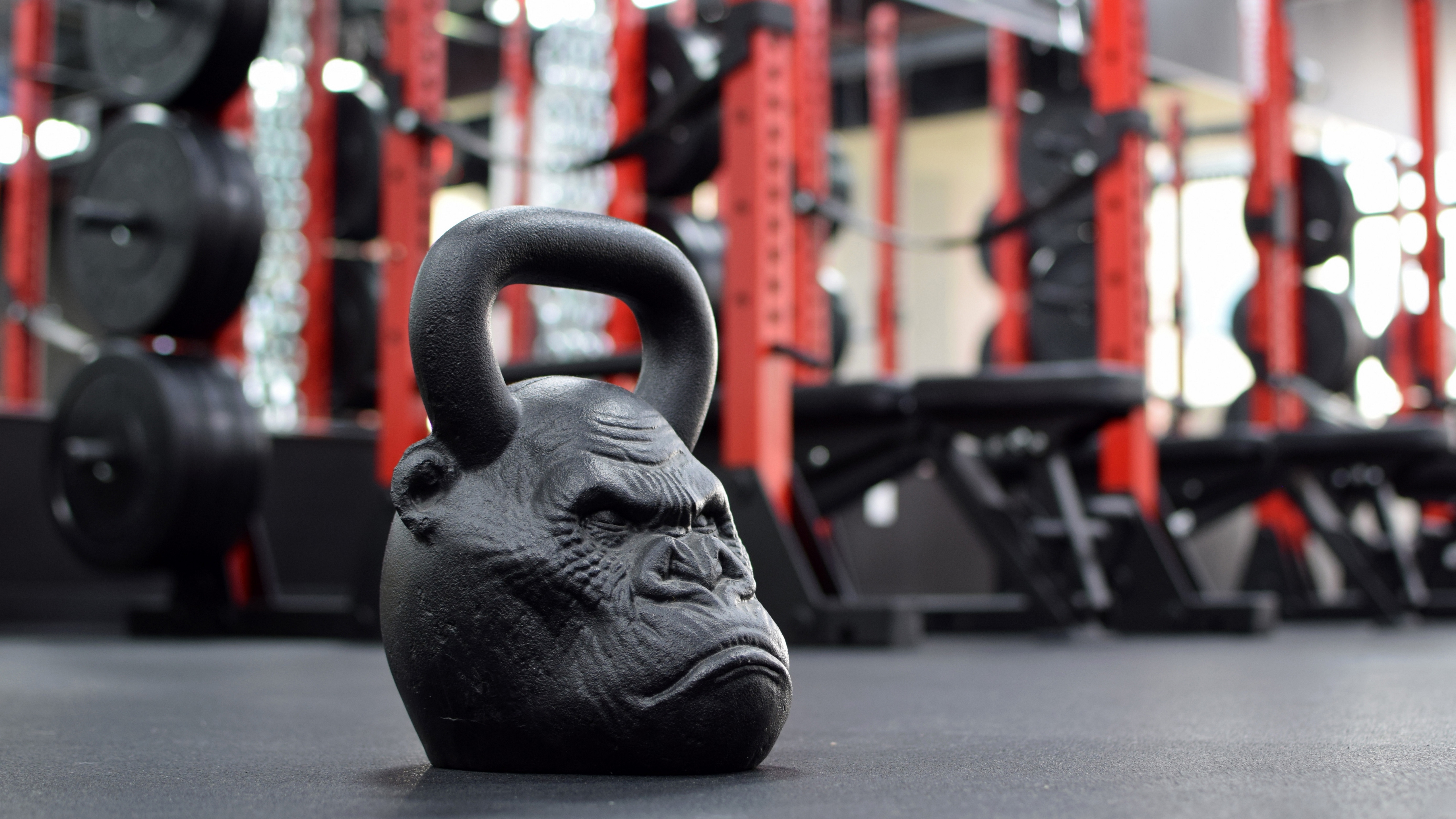 Description: A black kettle with a gorilla head on it in a gym with red racks of weight machines behind it.