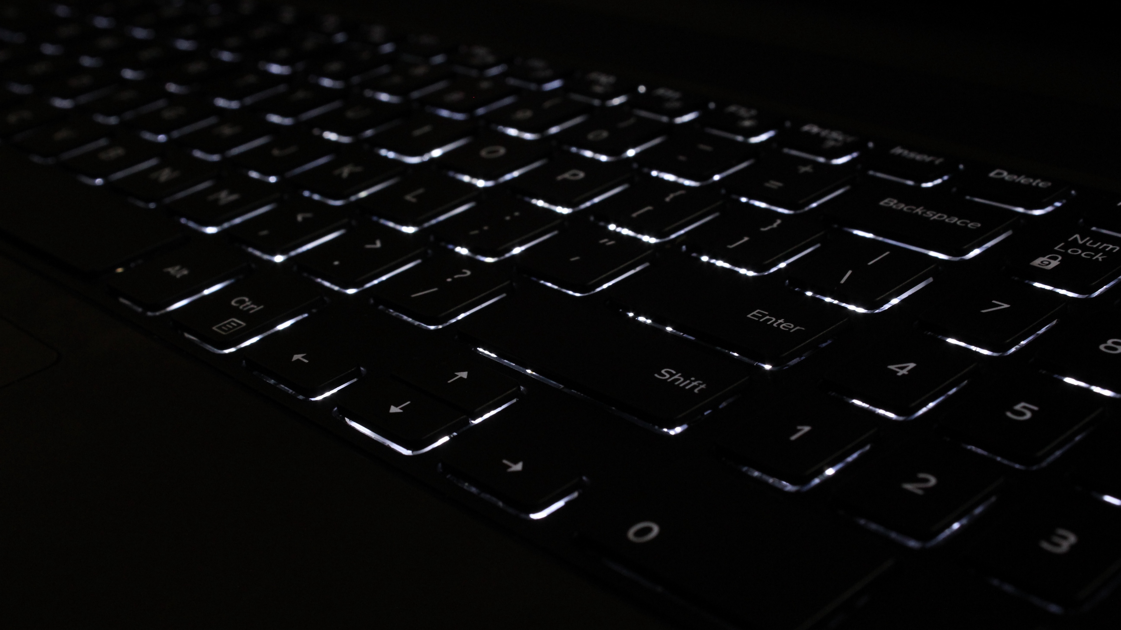 Description: A close up of a black keyboard with a black background and a light shining on it's side.