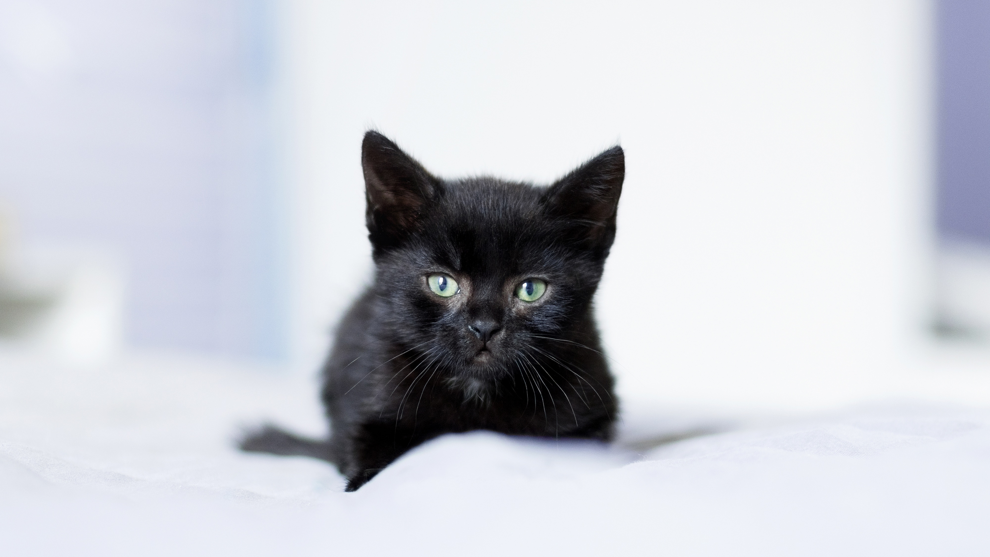 Description: A black kitten with green eyes laying on a bed with white sheets and pillows on it's side.