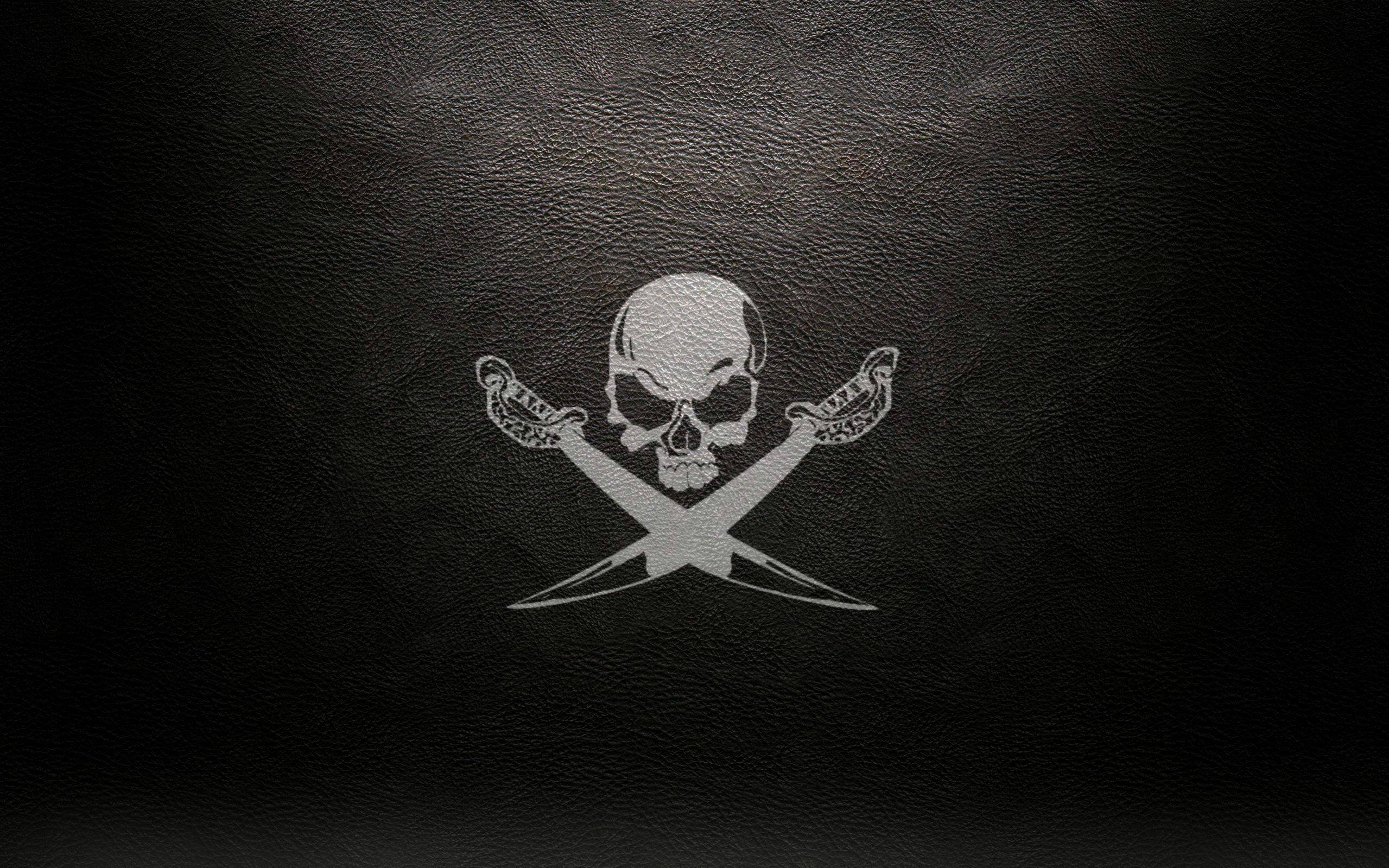 Description: A black leather background with a skull and two crossed swords on it.