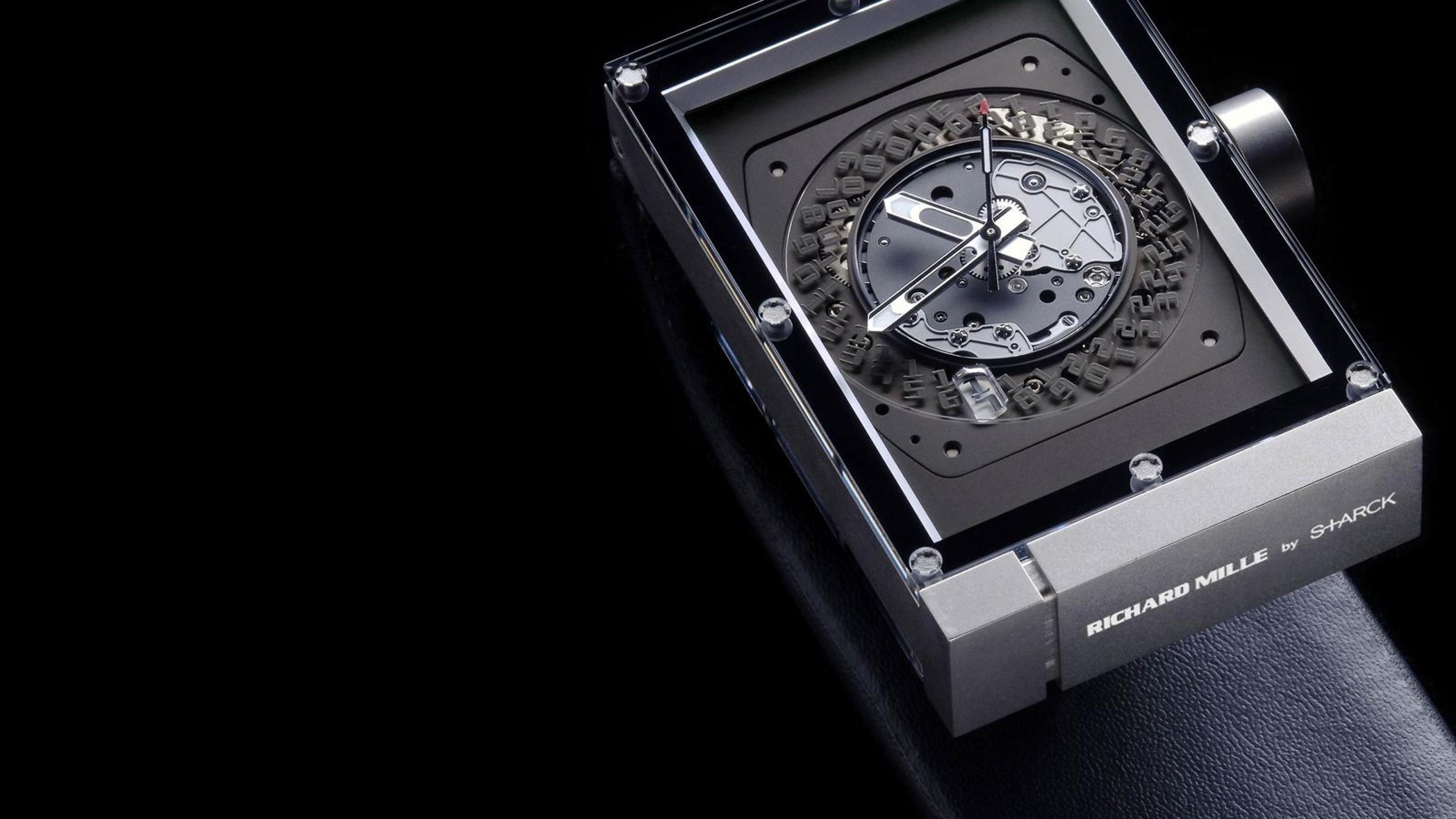 Description: A watch with a black leather strap and a black dial on the face of it.