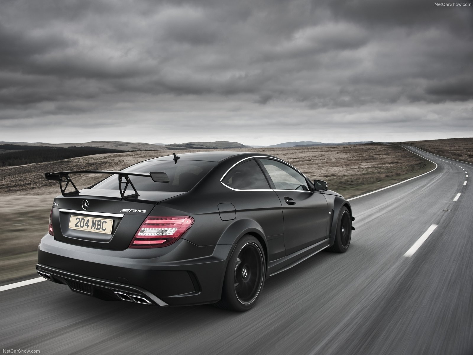 Description: A black mercedes benz coupe driving down a road with a cloudy sky in the background and a car with a roof rack on it.