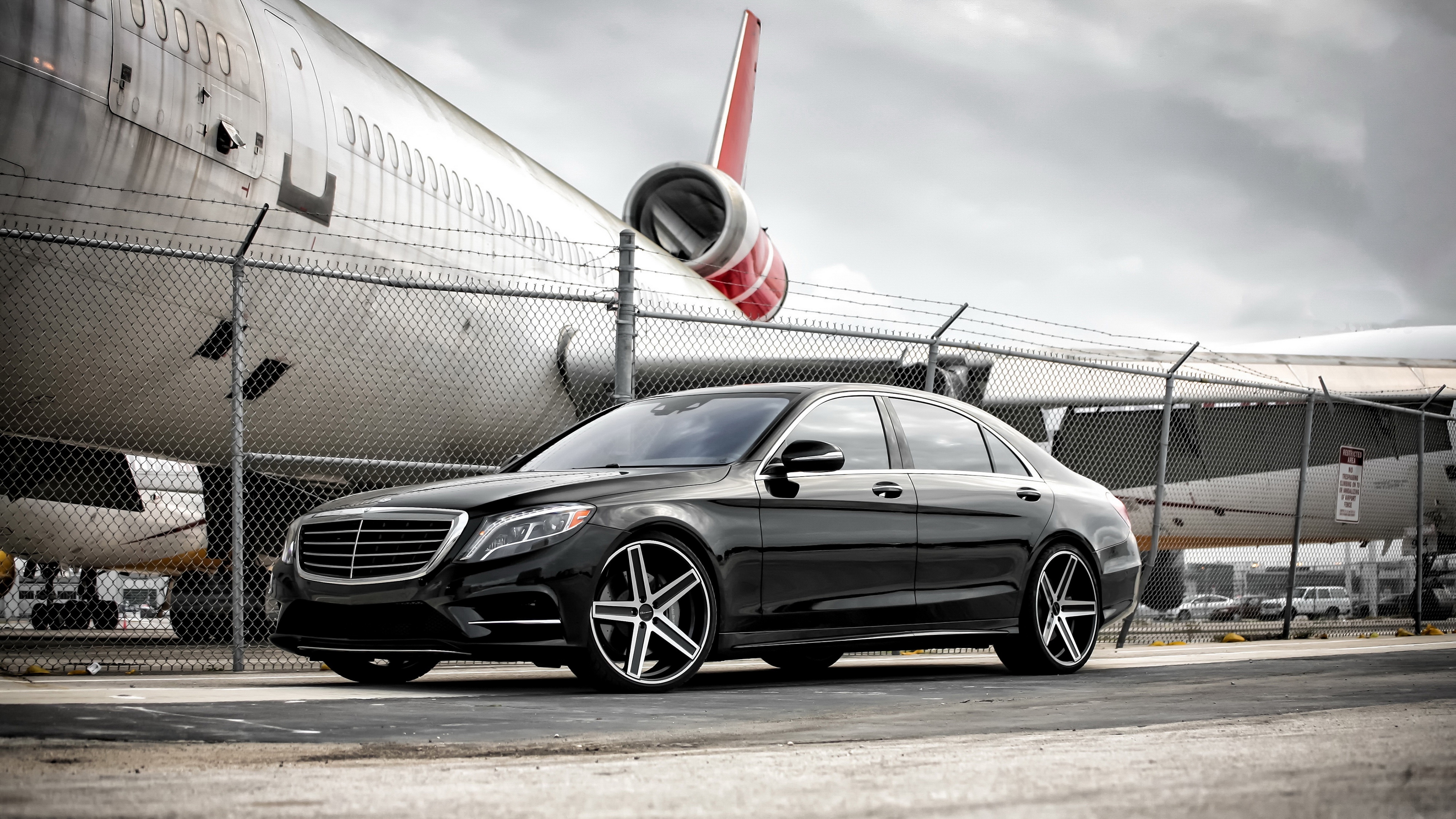 Description: A black mercedes parked in front of a plane on a runway with a cloudy sky behind it and a plane behind it.