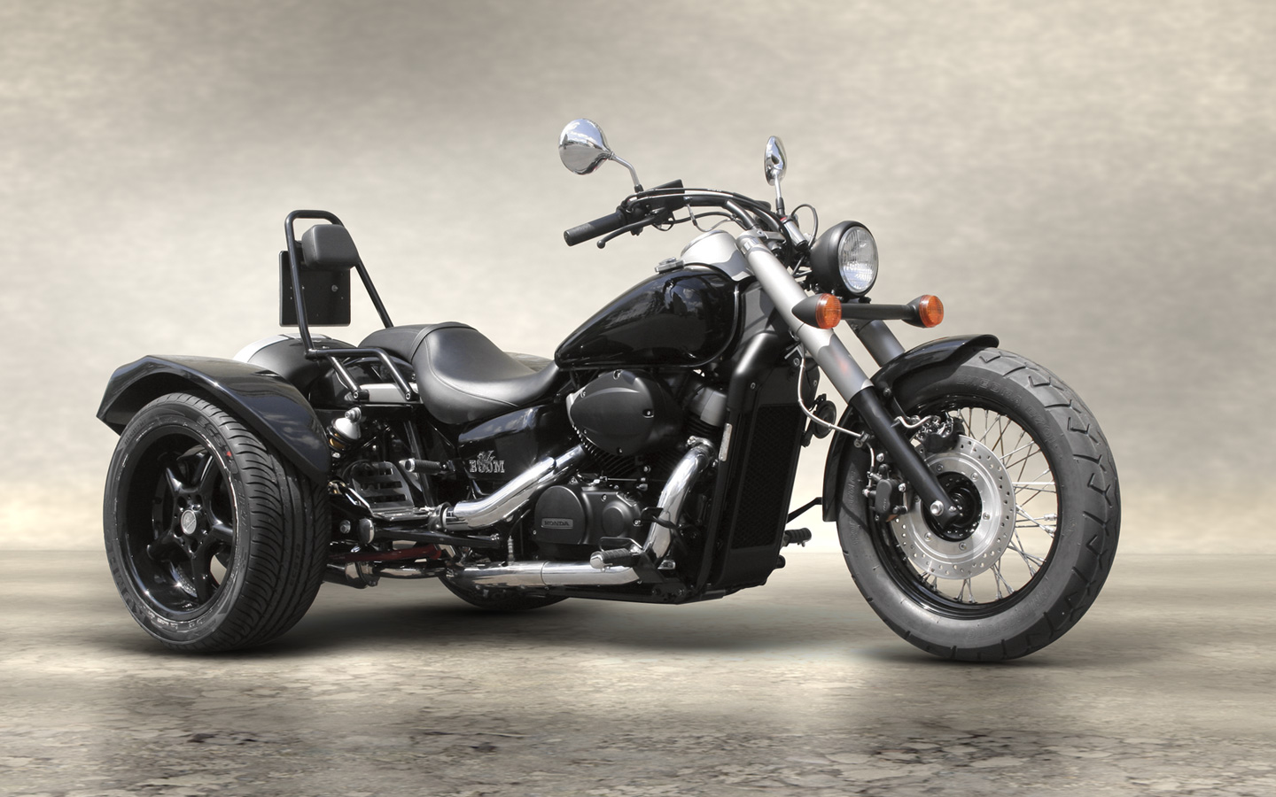 Description: A black motorcycle parked on a cement floor next to a wall with a gray background and a gray wall.