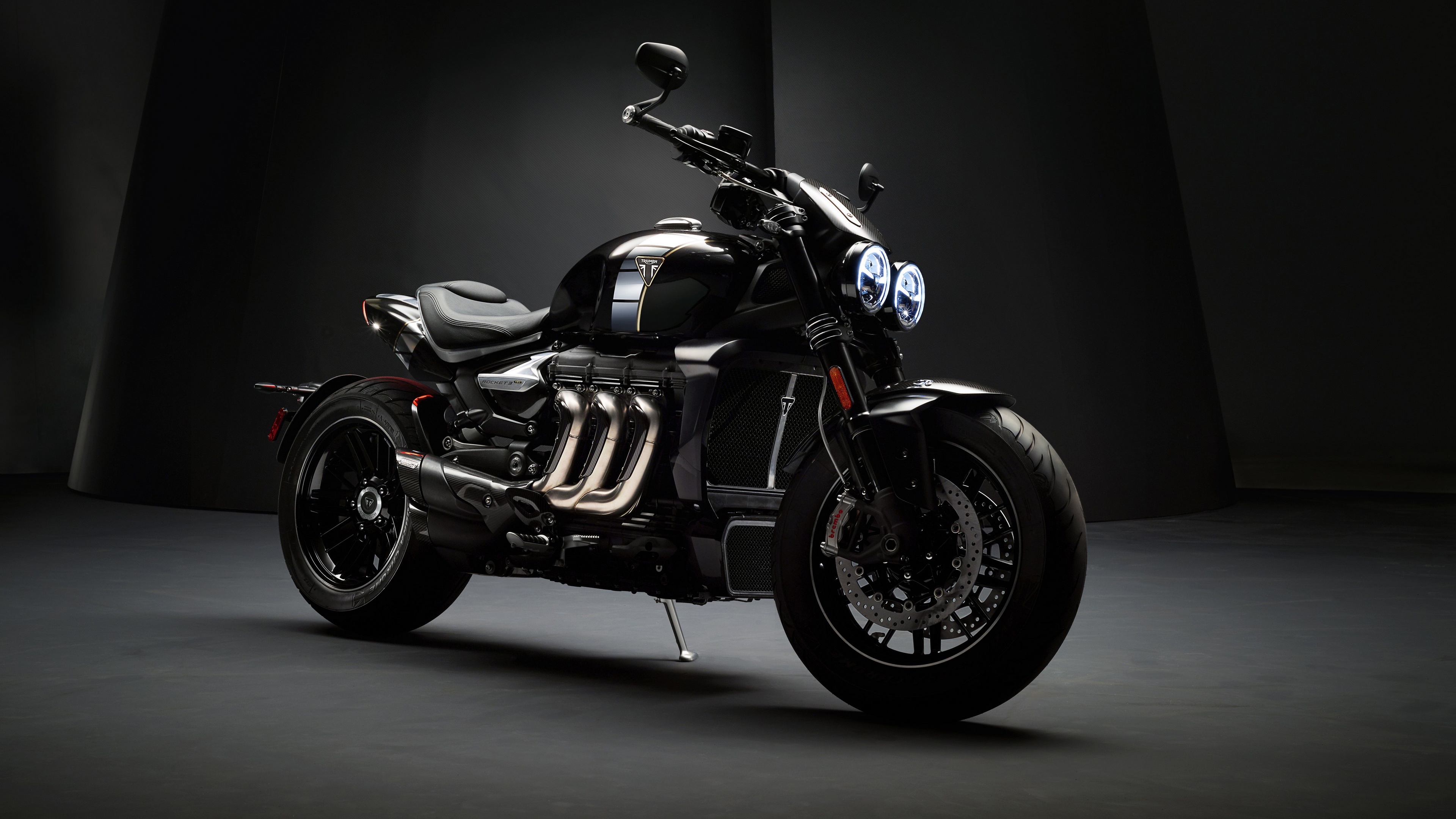 Description: A black motorcycle is parked in a dark room with a black background and a black light behind it and a black background.