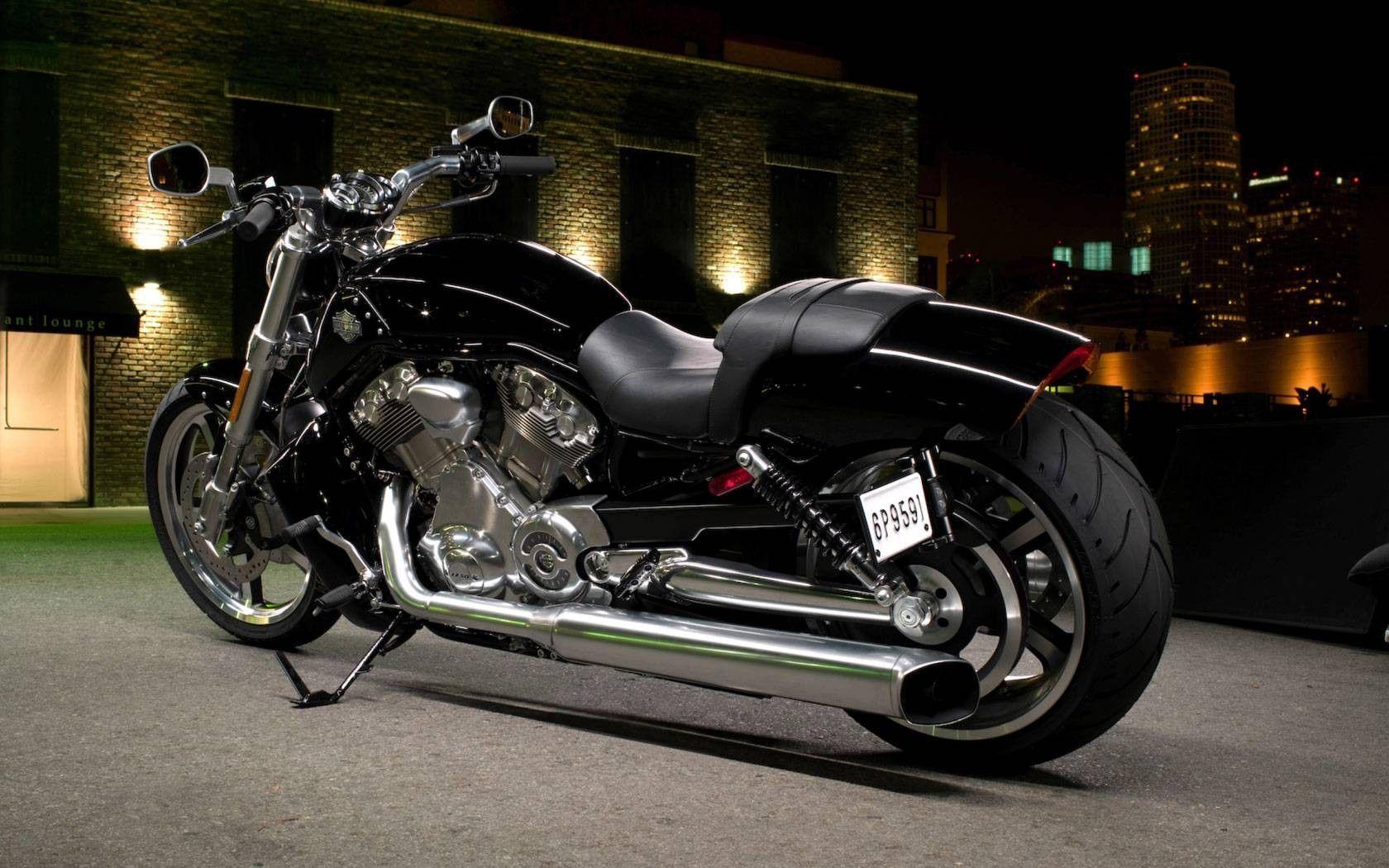 Description: A black motorcycle parked in front of a building at night with a city skyline in the background at night.