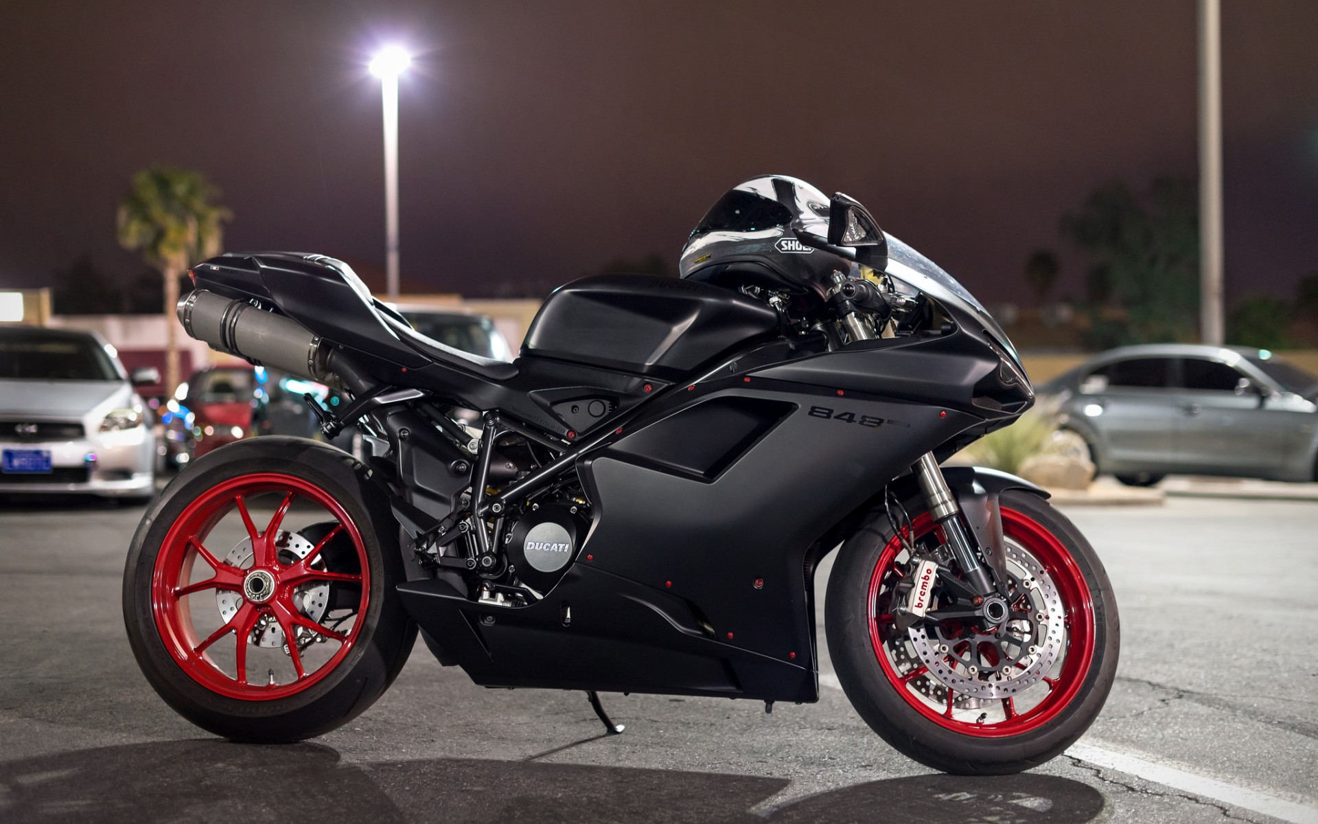 Description: A black motorcycle parked in a parking lot at night time with red rims and red tires and a helmet on the seat.