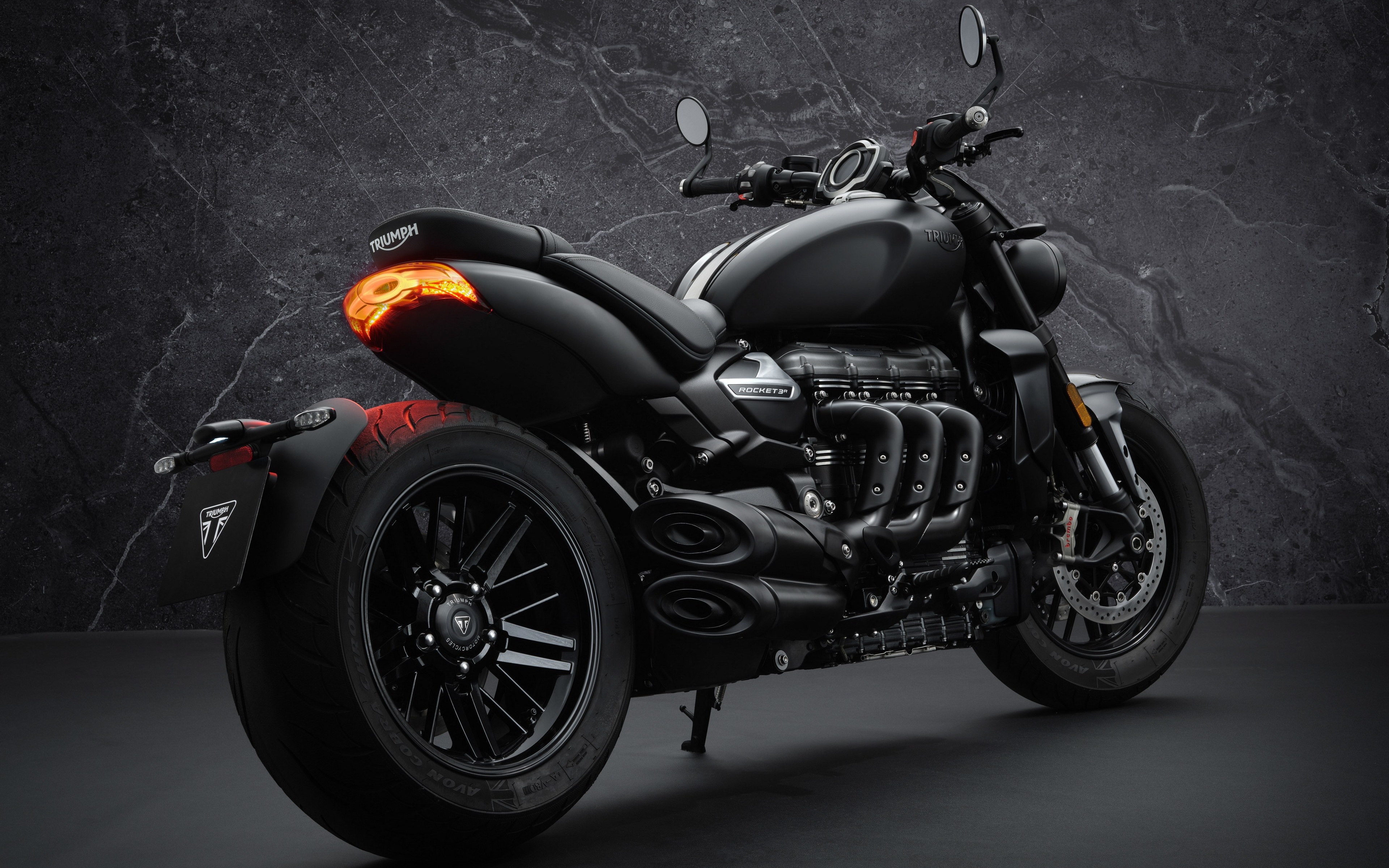 Description: A black motorcycle with a red light on the back tire and a black background with a black wall and a black floor.