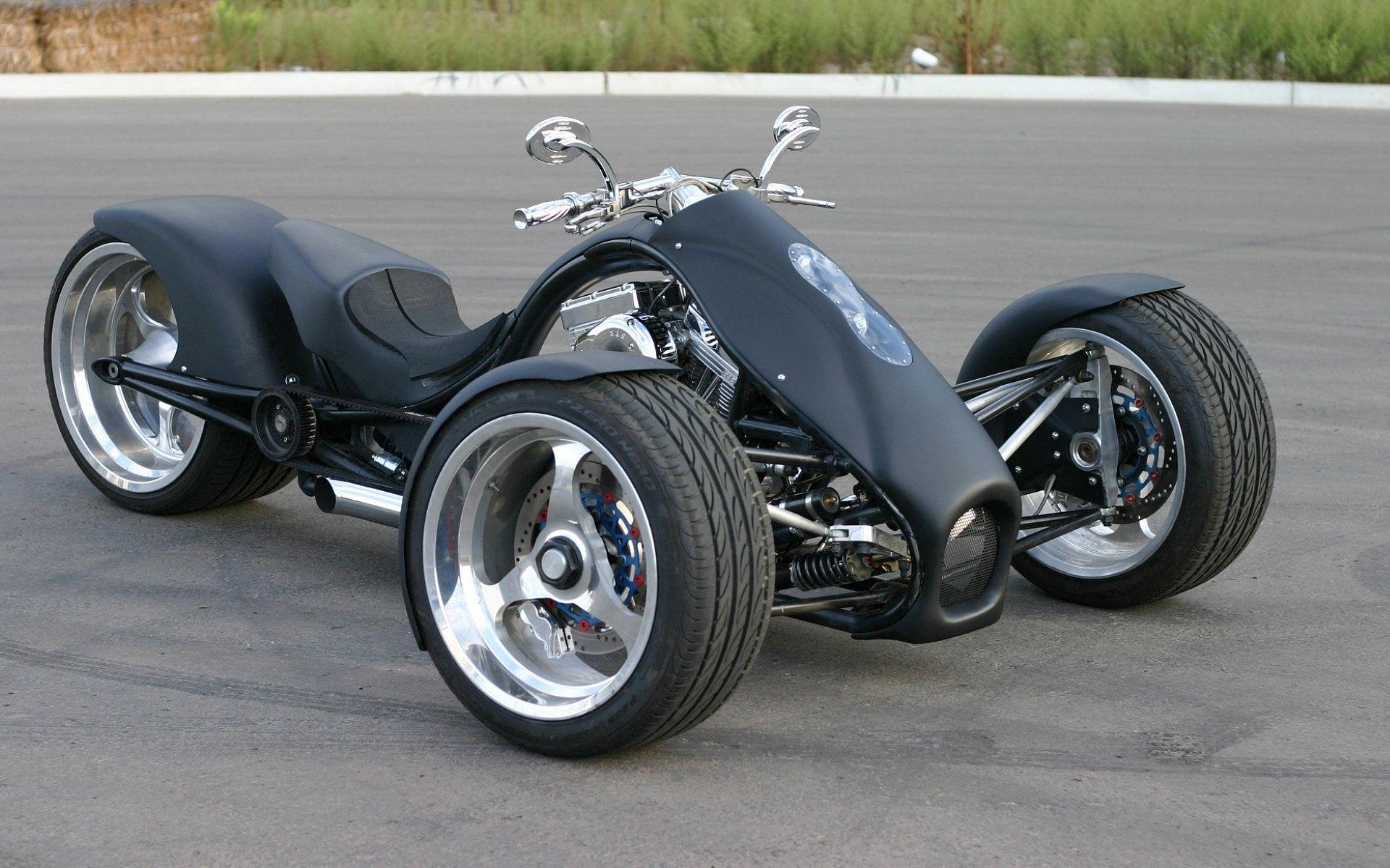 Description: A black motorcycle with a side car on a parking lot with grass in the background and a building in the background.