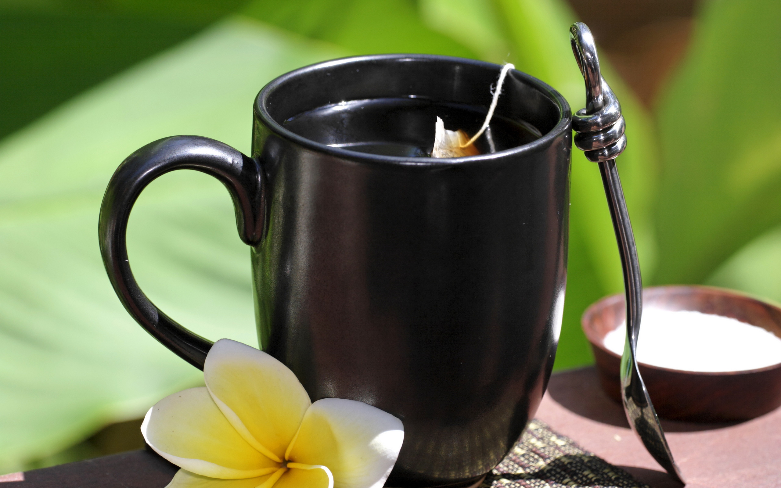 Description: A black mug with a flower and a spoon on a table next to it and a spoon in the background.