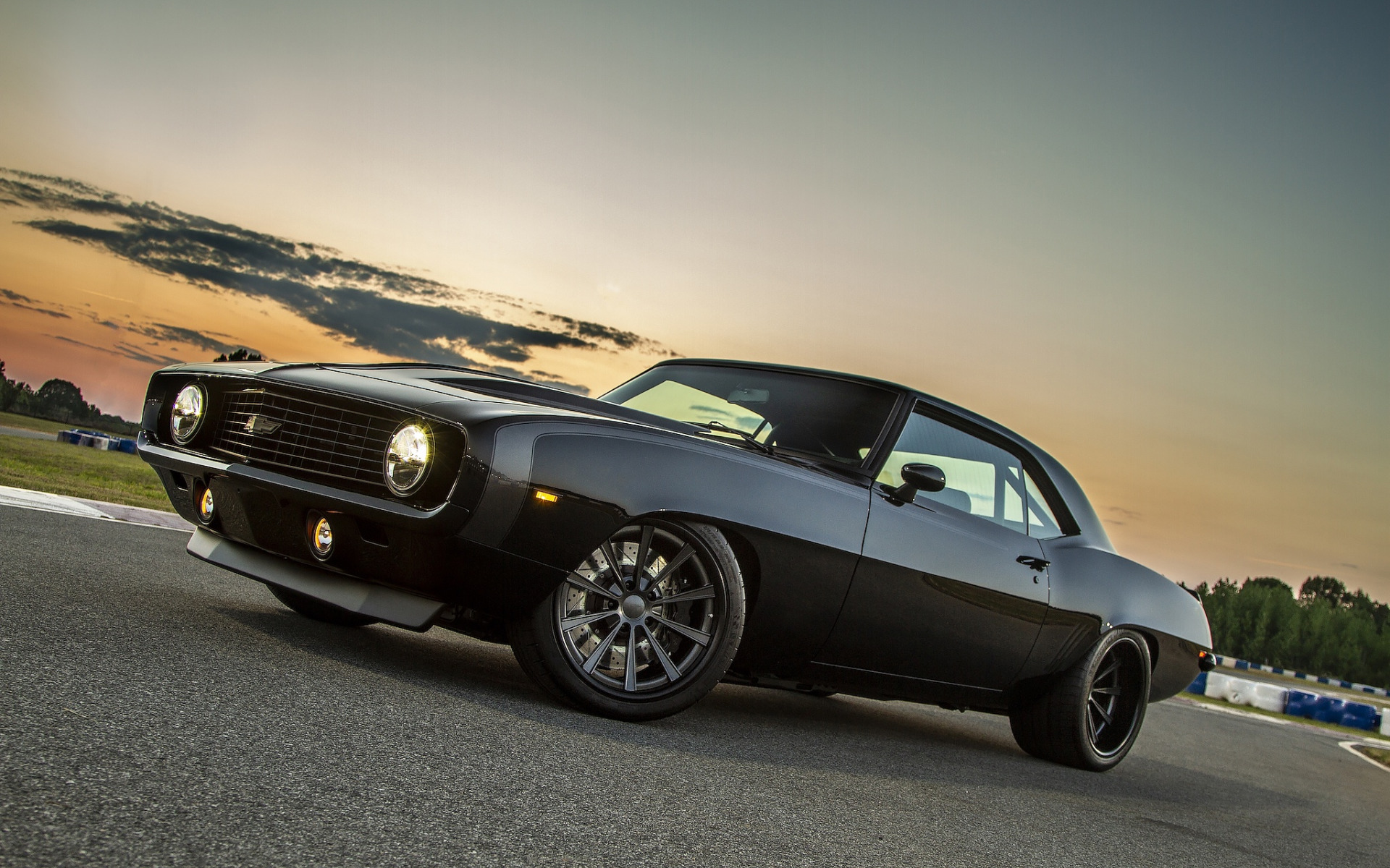 Description: A black muscle car driving down a road at sunset or dawn with the sun setting behind it and clouds in the sky.