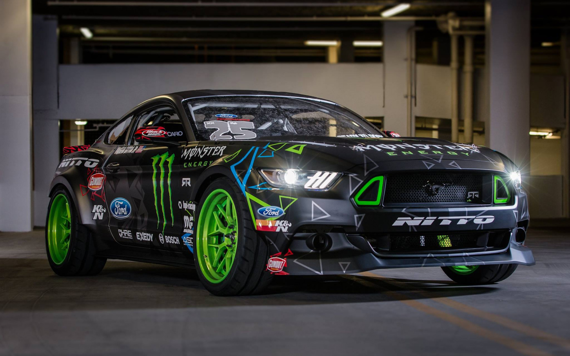 Description: A black mustang with green wheels and a green rim is parked in a parking garage with a white wall.