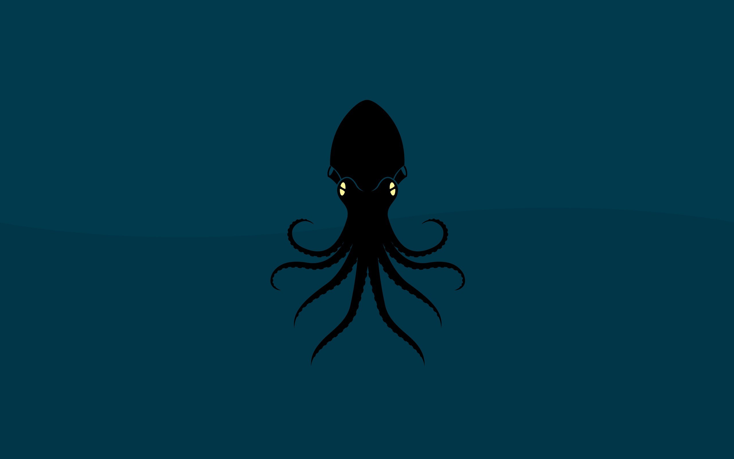 Description: A black octopus with glowing eyes and a dark background is featured in this image.