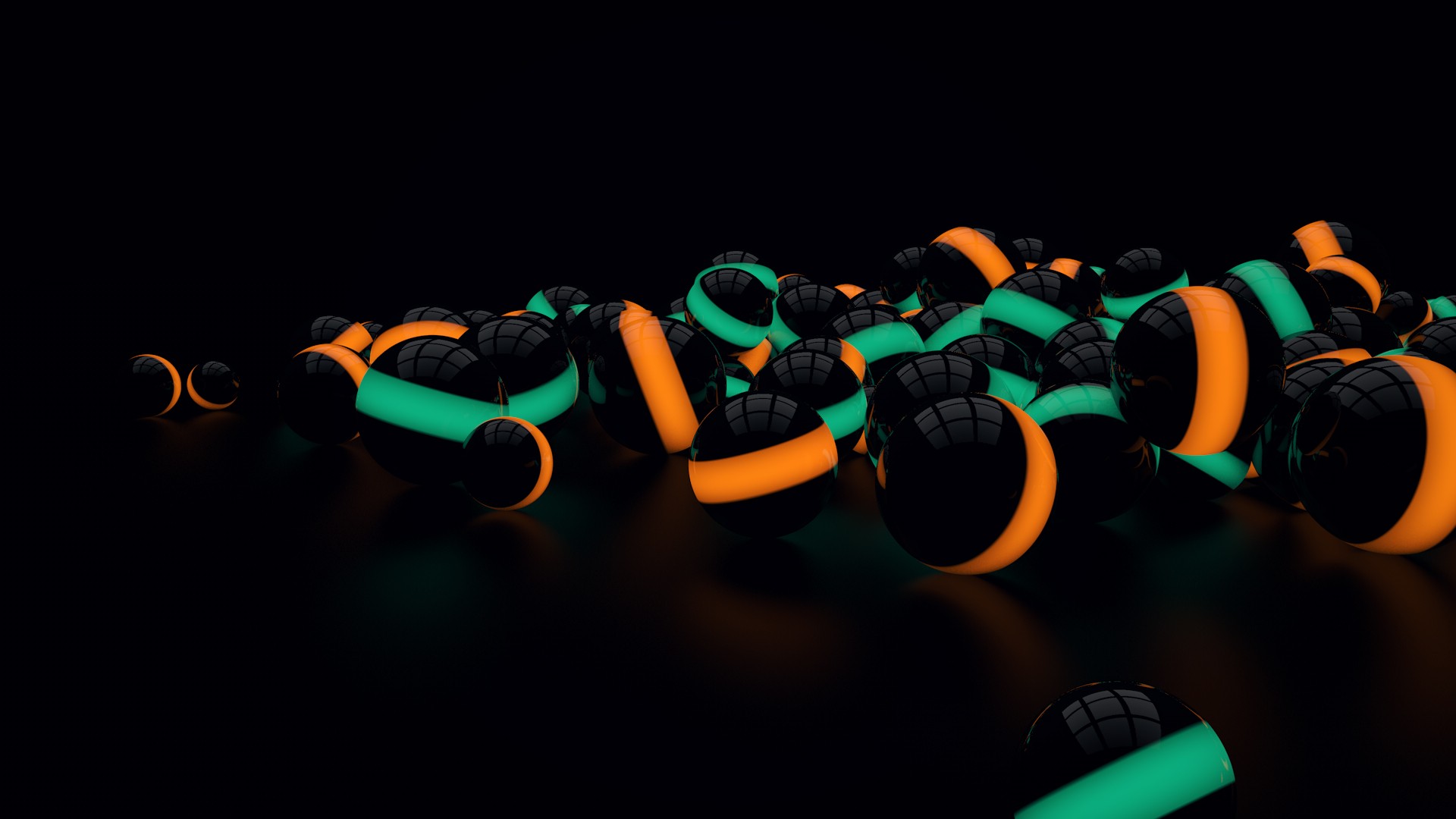 Description: A group of black and orange balls with neon green handles and handles on them.