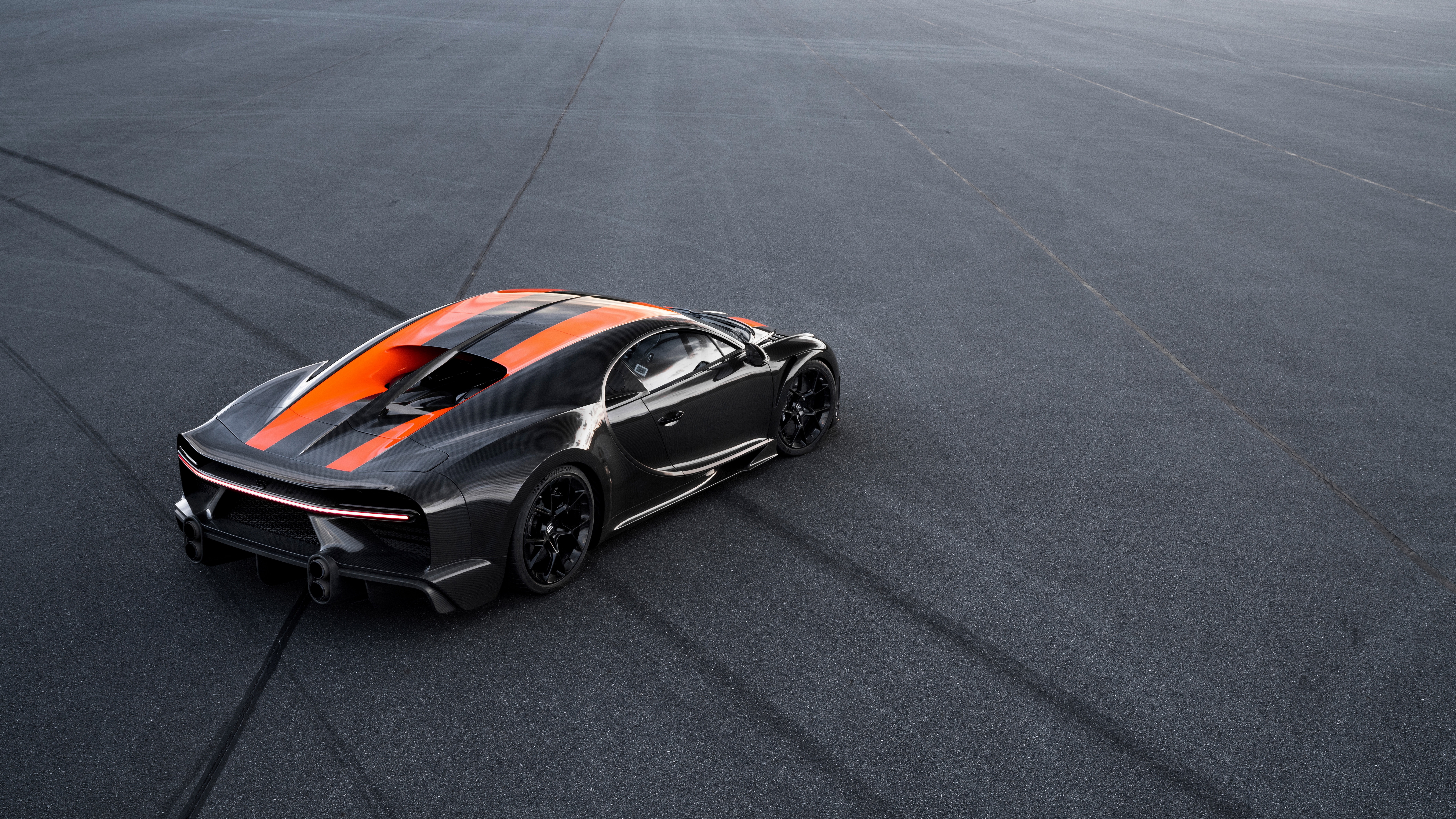 Description: A black and orange sports car driving on a race track with a sky background and a line of lines.