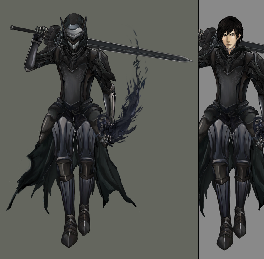 Description: A character in a black outfit with a sword and a demon on his back.