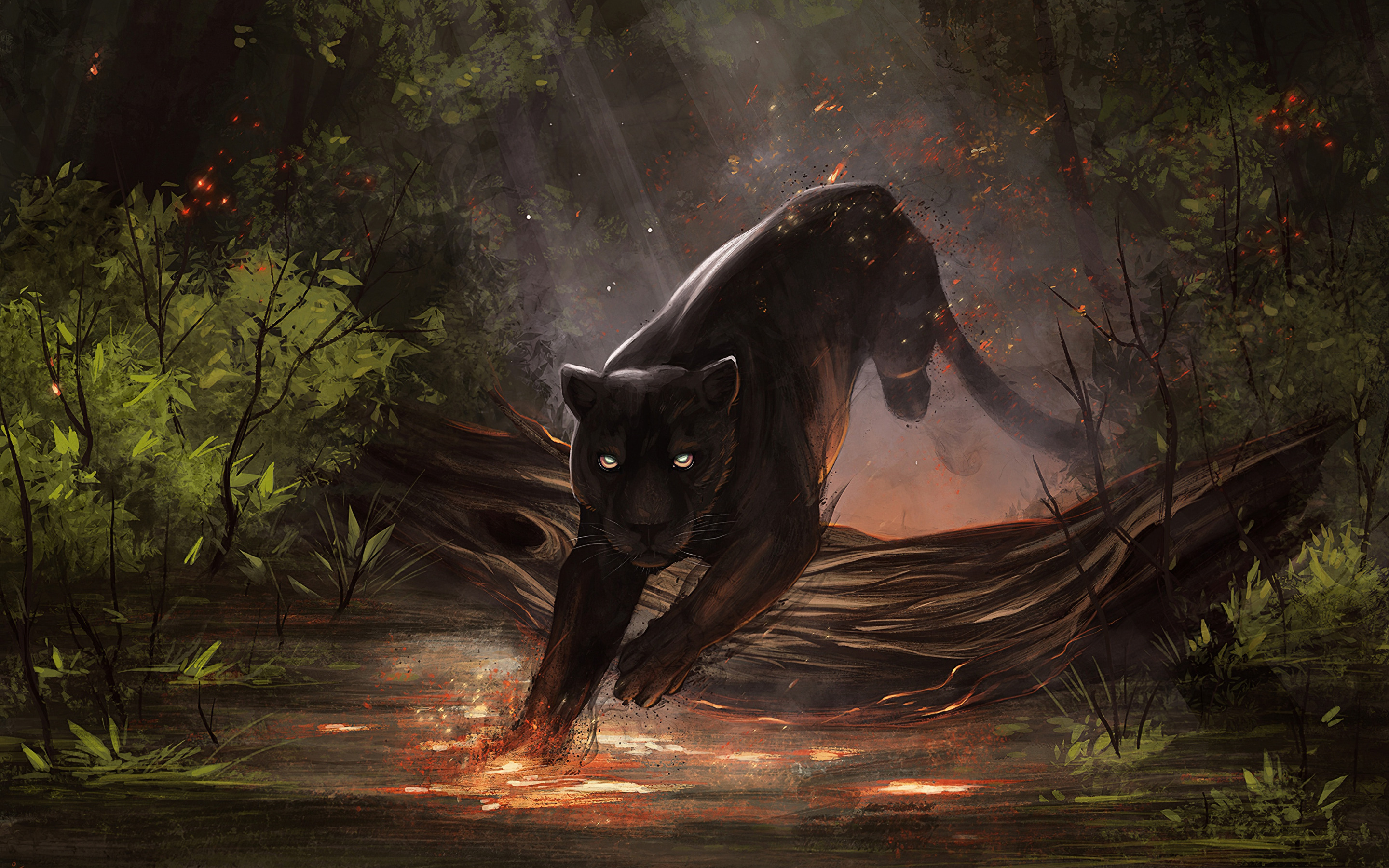 Description: A painting of a black panther running through a forest with fire in its mouth and a body of water.