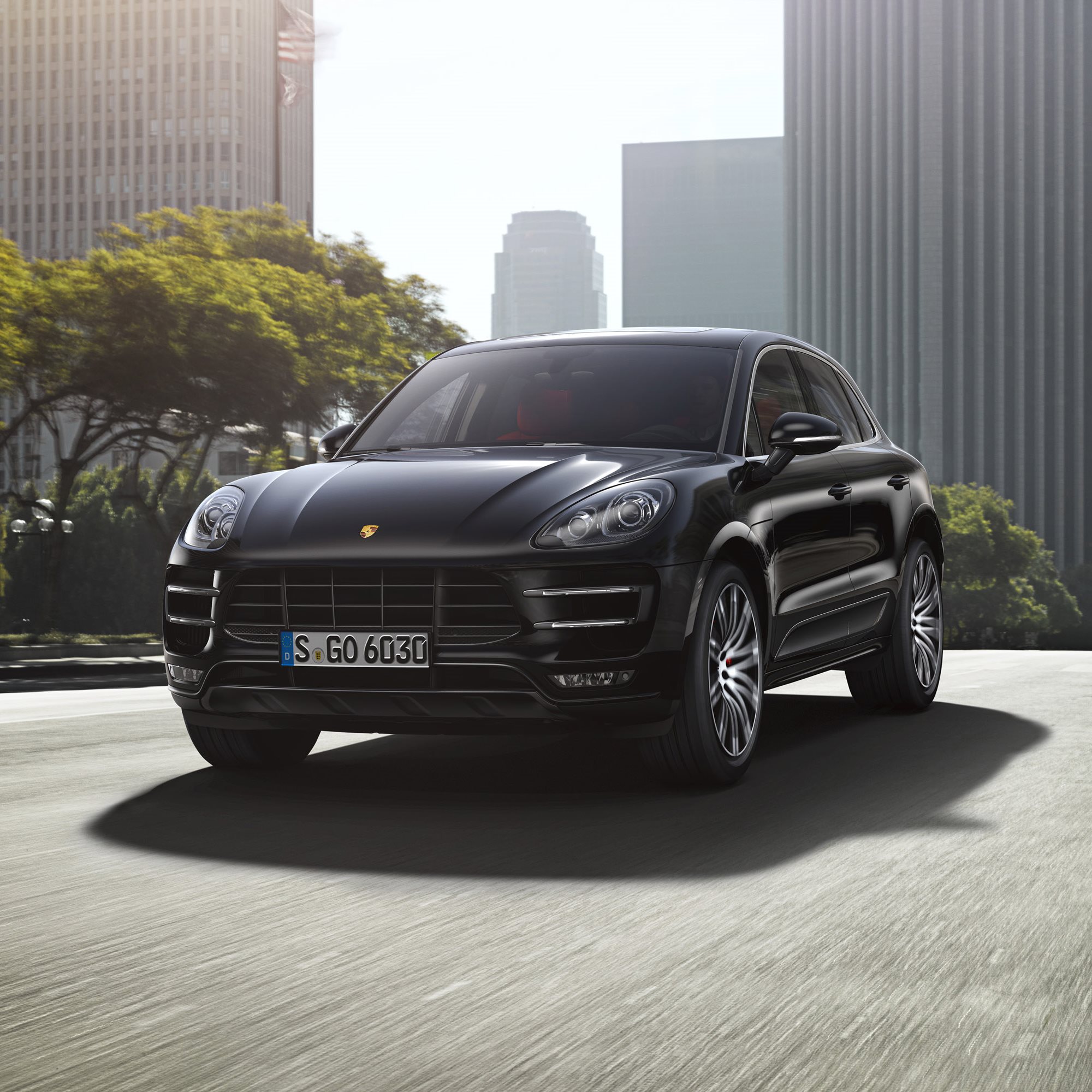 Description: A black porsche cayen driving down a city street with tall buildings in the background and a bright sun shining on the car.