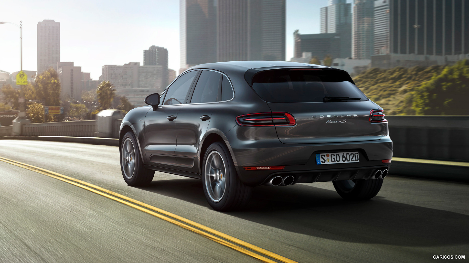 Description: A black porsche cayen driving down a city street with tall buildings in the background and a yellow line on the road.