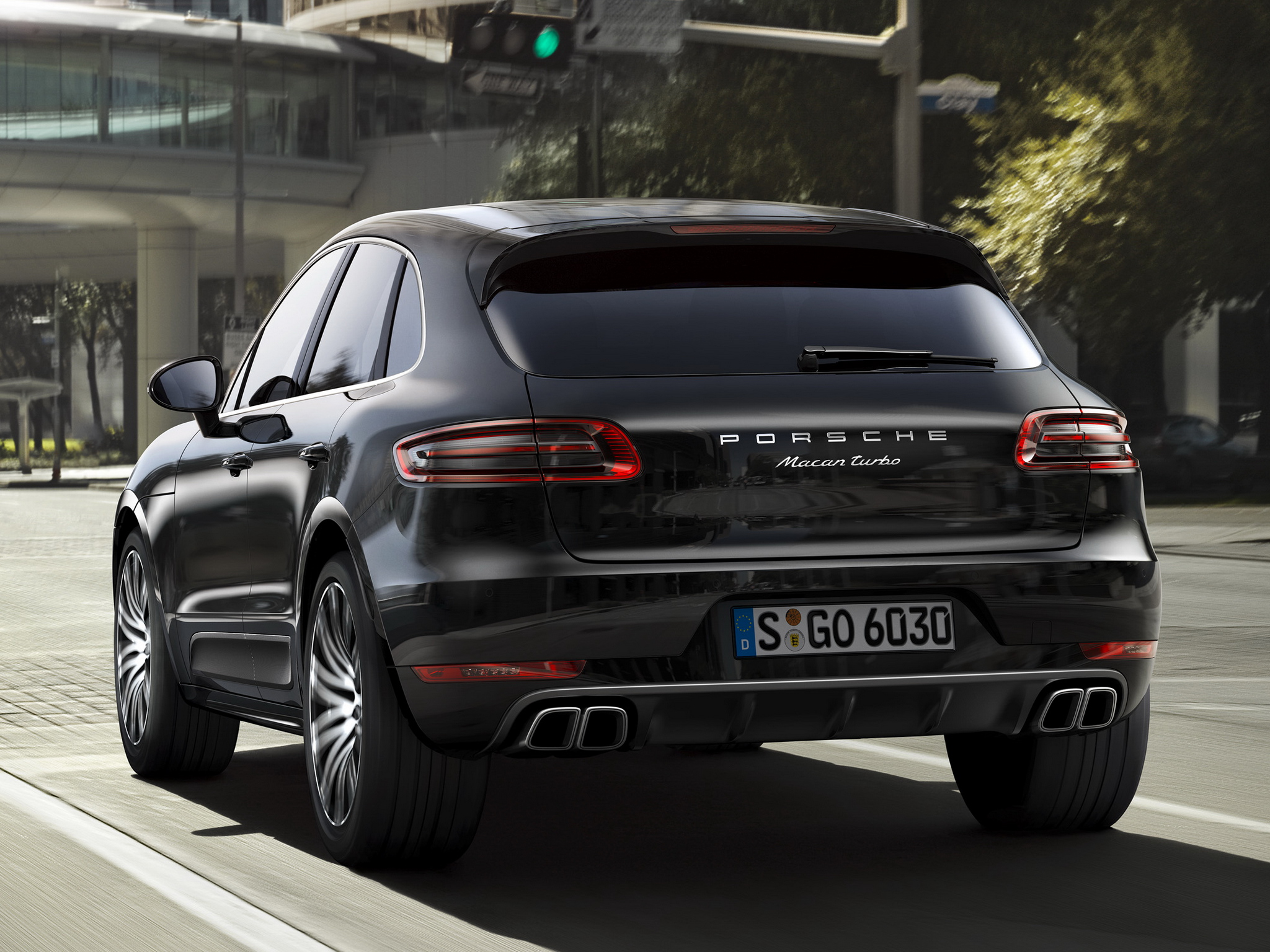 Description: A black porsche cayen driving down a city street with a traffic light above it's headlight.
